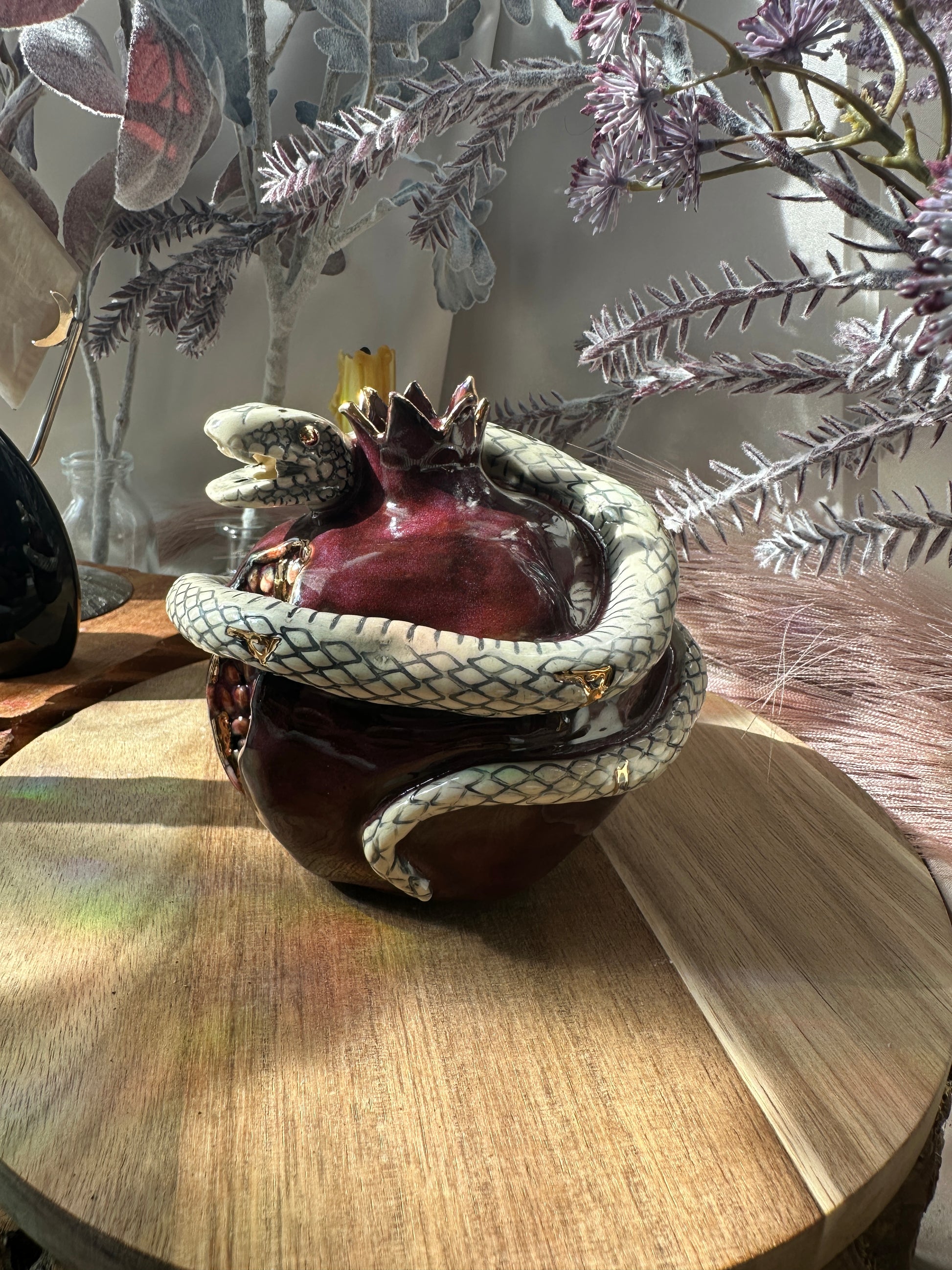 As with all my work, everything is done by hand. This piece in particular was crafted with patience and love. I smoothed every curve, rolled and shaped every seed with my fingers, added every single scale on the snake... one by one. As its creation evolved, so did my wonder for what is possible when we set our mind to it.