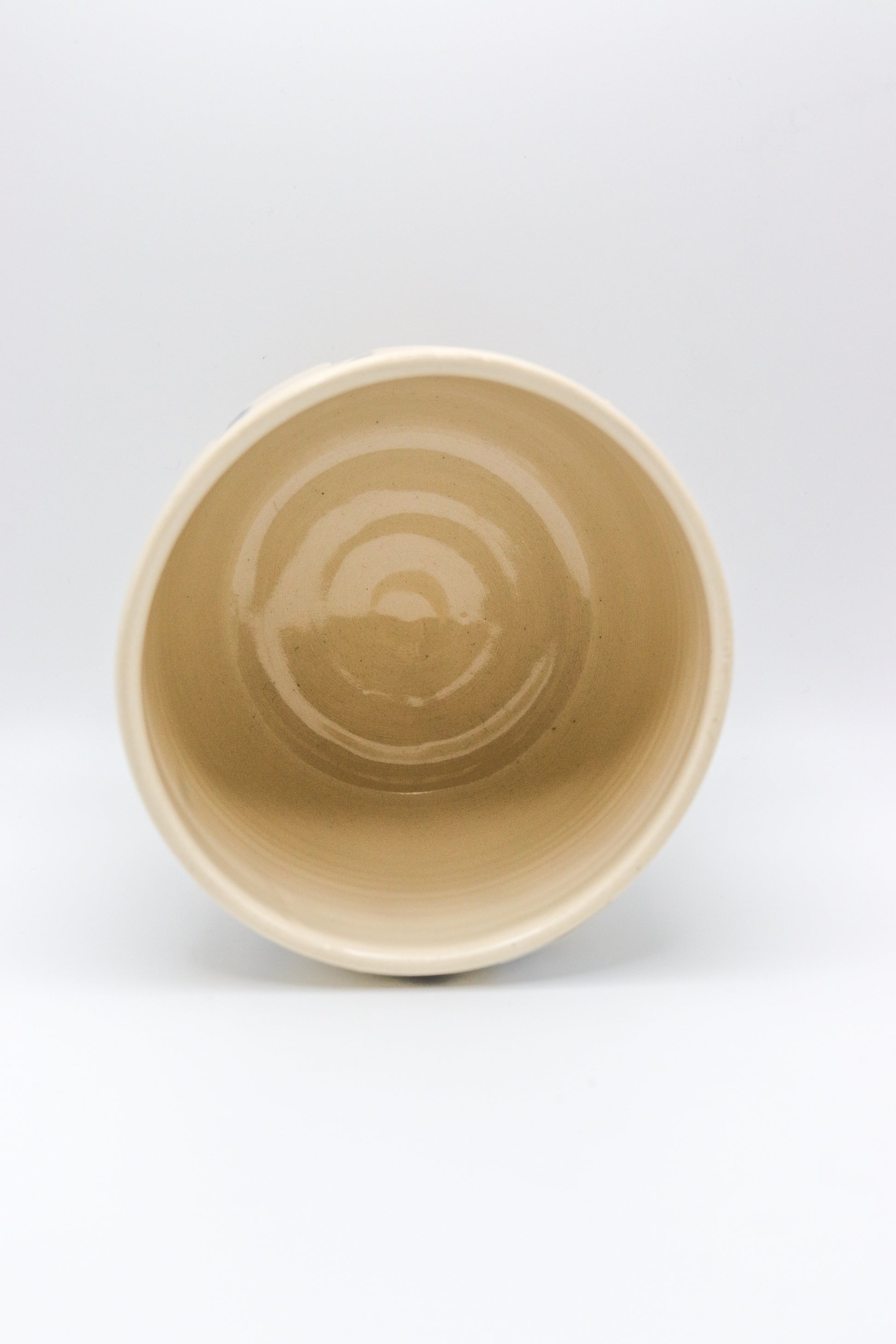 This happy little planter is ready to brighten up your workspace or home. It is wheel thrown and hand carved. Its got an openi9ng 3.5 inches wide and is 3.5 inches deep.