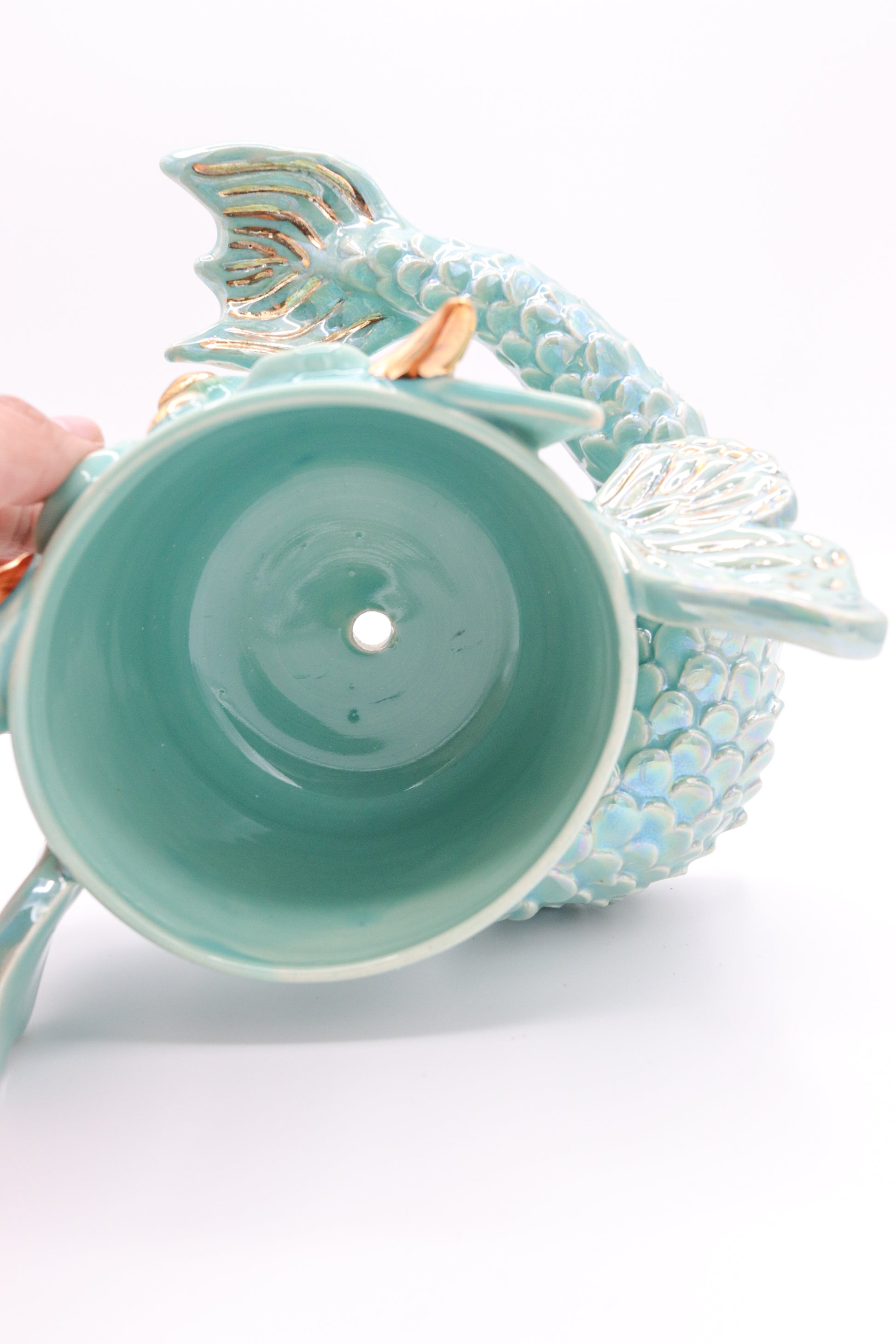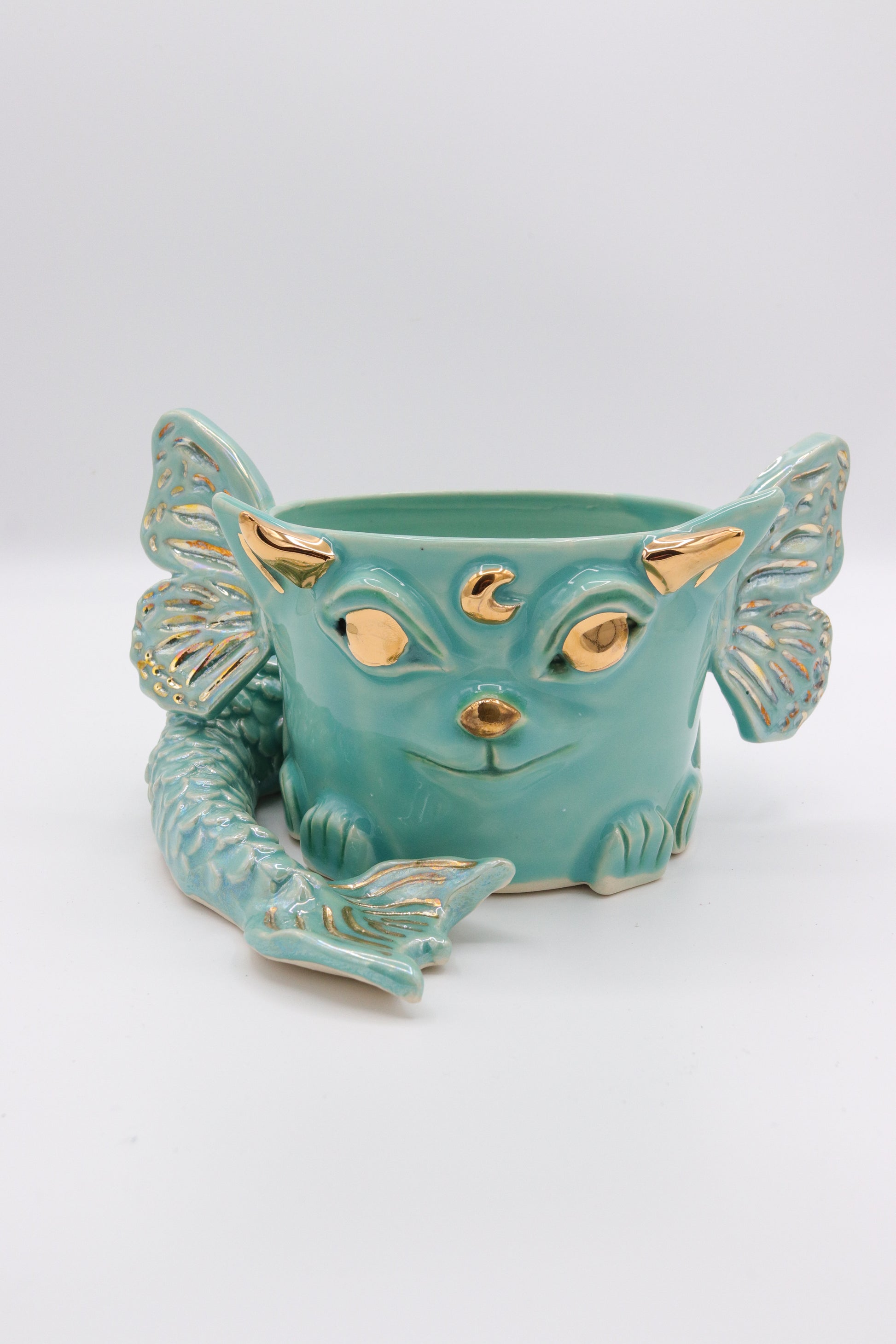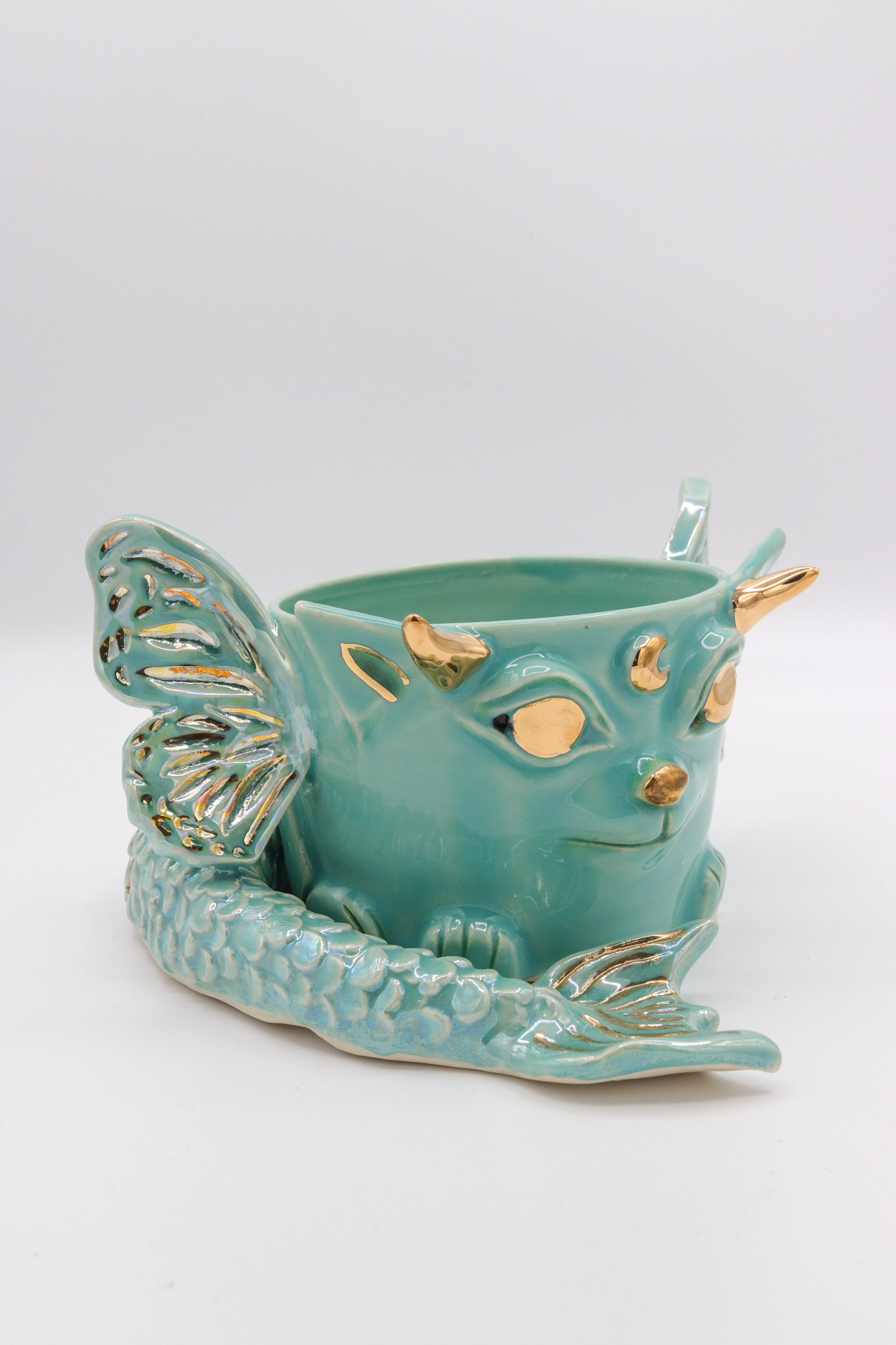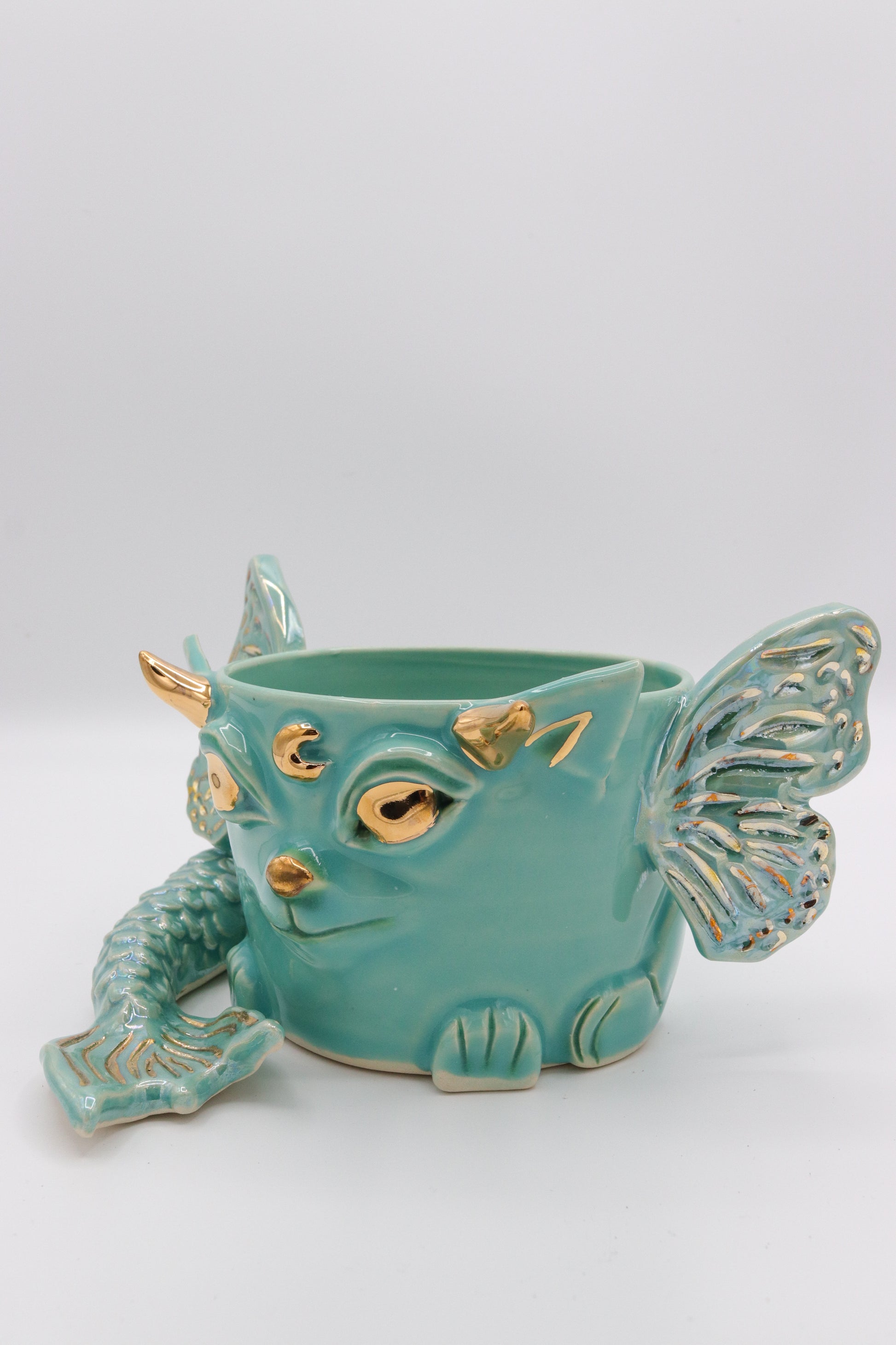 These babies are made with love and take about a month to create. They are wheel thrown, carved/sculpted and dried for a week then fired in a kiln at approximately 1,975 degrees F. After the first firing they are glazed and dried for 24 hours minimum before going in the kiln again (reaching approx 2,270 degrees F) for the colorful and shiny glass finish. After the second firing these celestial creatures are embellished with Gold Luster and fired one last time.