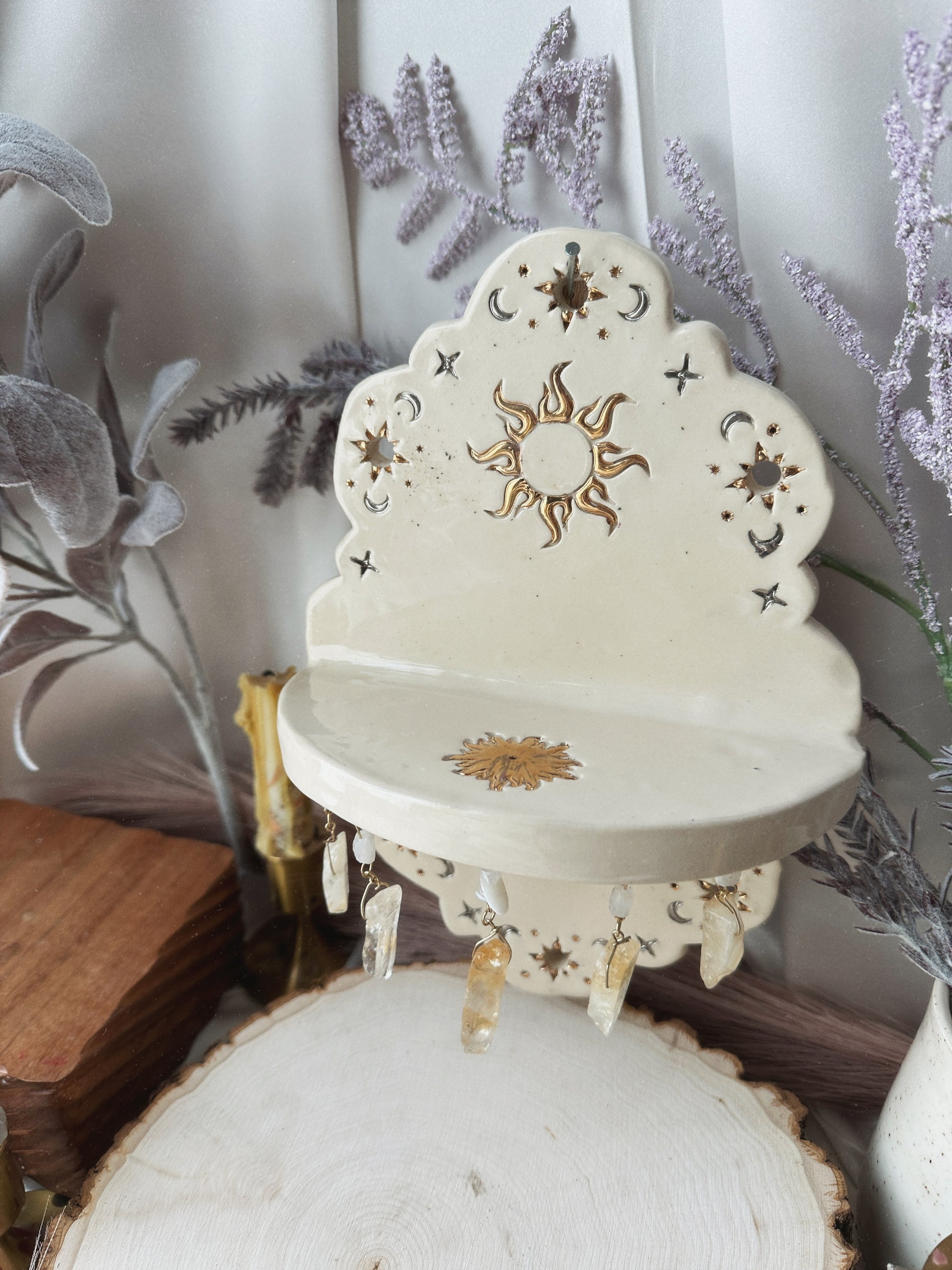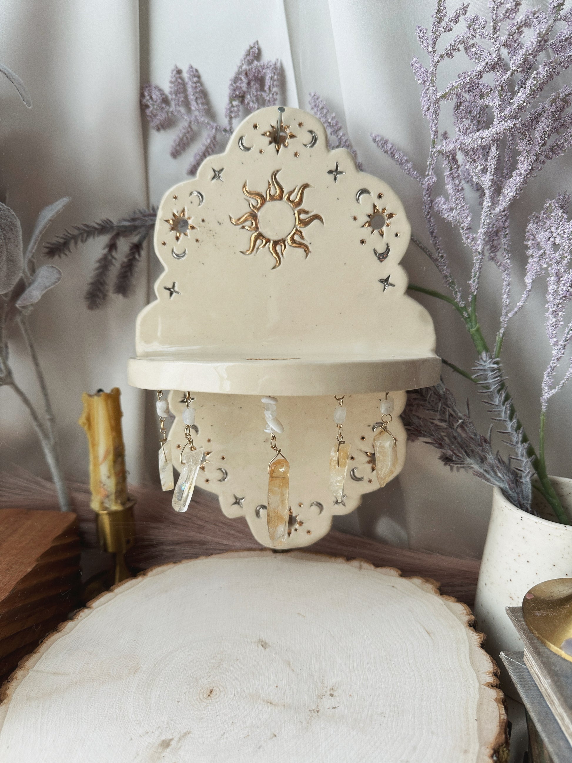 This hanging altar has been handcrafted for your sacred space. It’s perfect for devotional or magical intent. Because these altars are small, the practitioner must be selective in what you place on your altar. You could use your limited space as a working platform for a spell, as a sacred shrine for a certain deity or saint, making an offering or burning incense to cleanse your space.