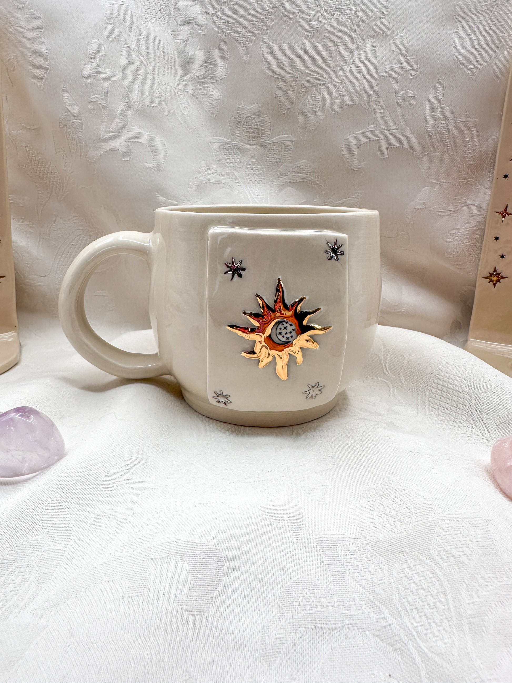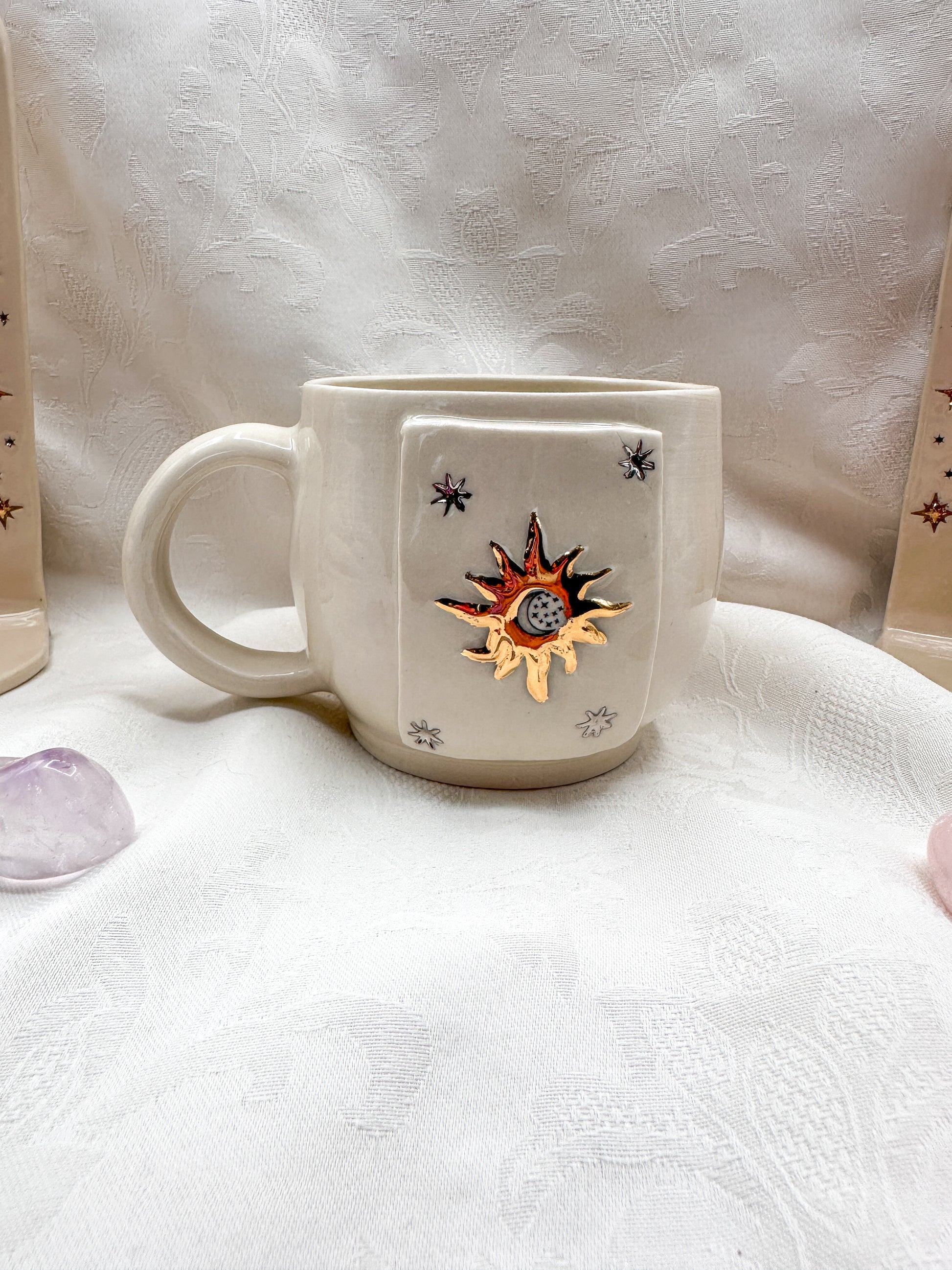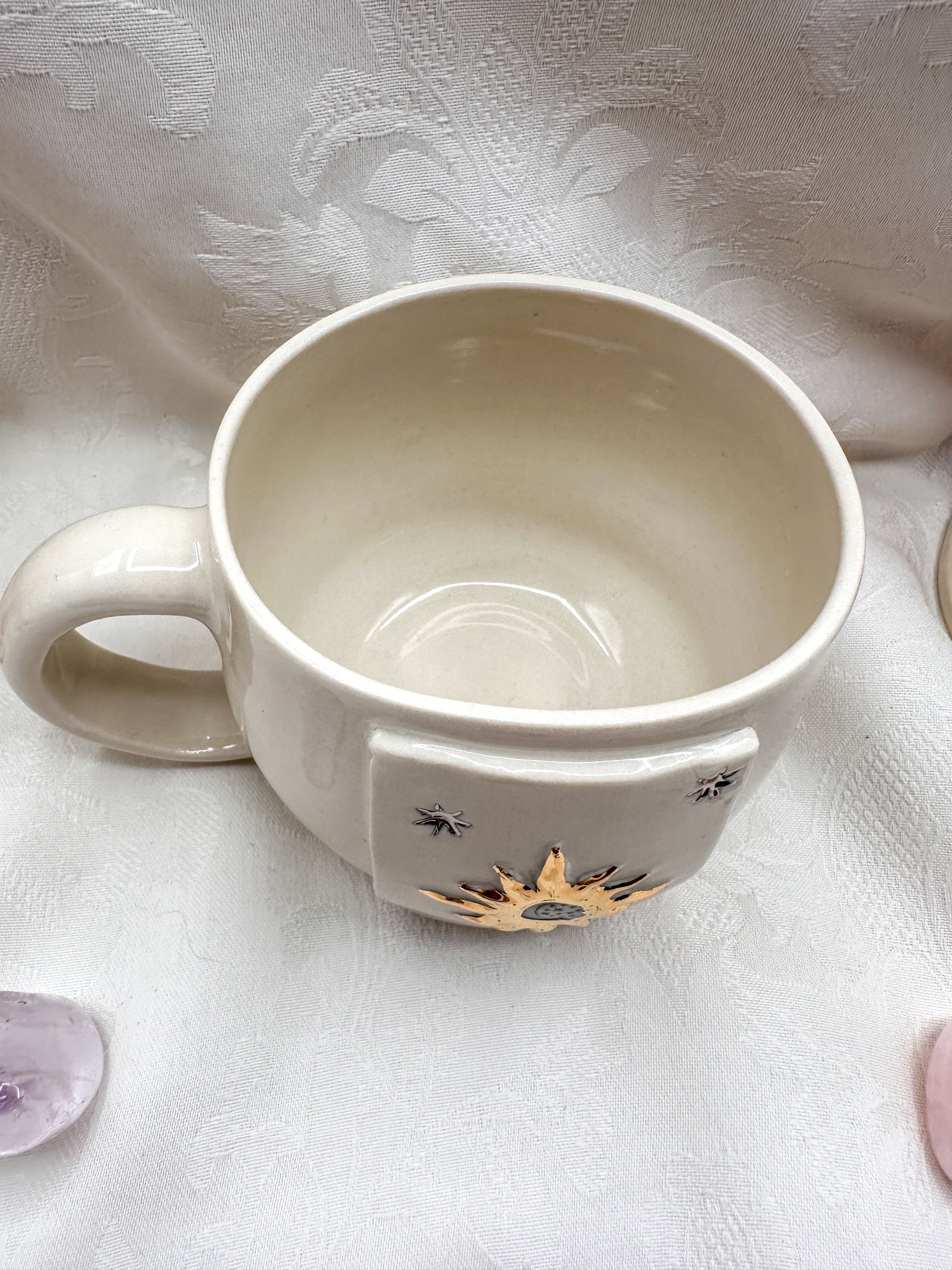 This celestial mug is wheel thrown and accented with real 22k gold. It is not microwave or dishwasher safe. It is 3.5 inches wide and 3 inches deep.