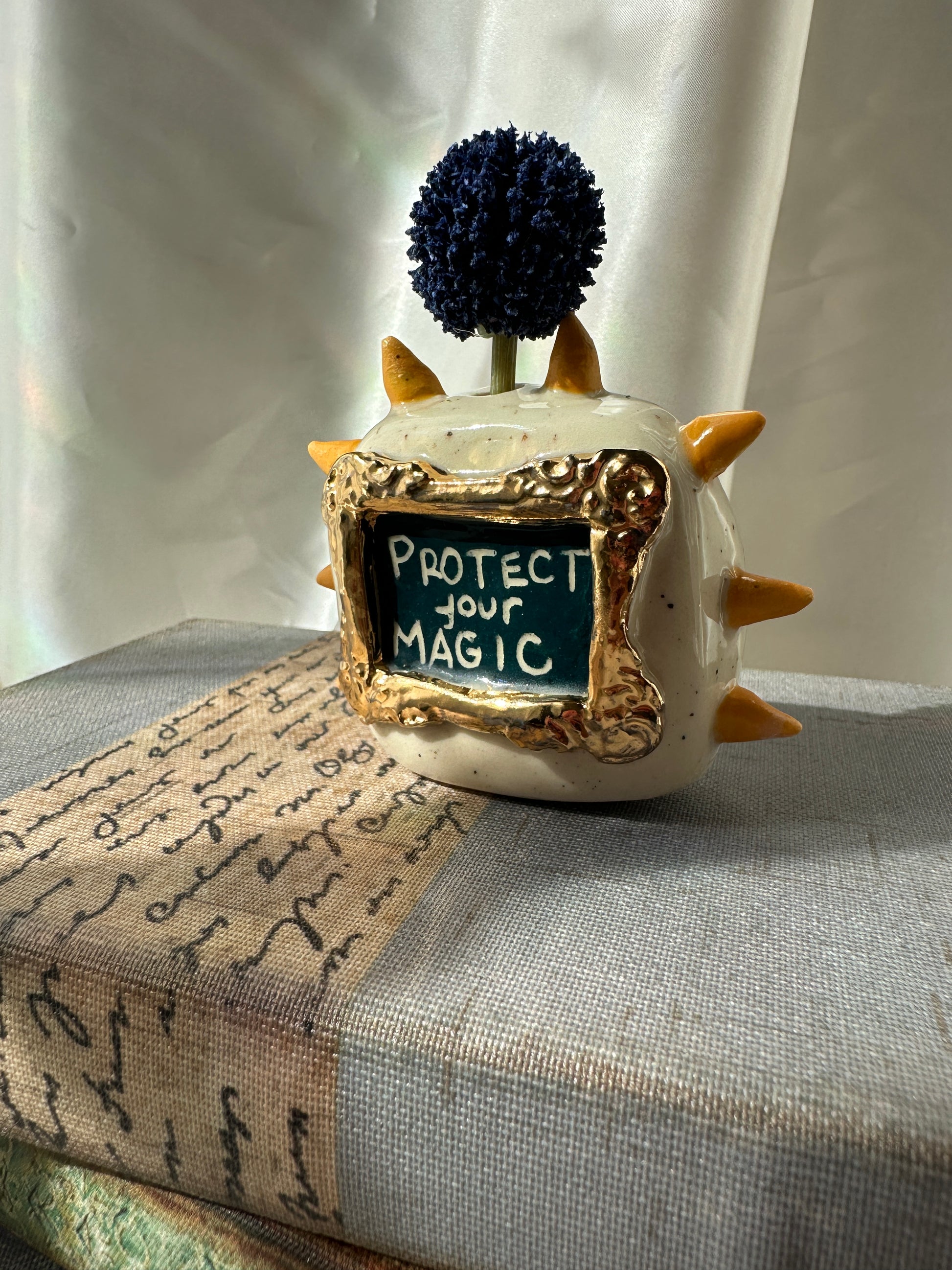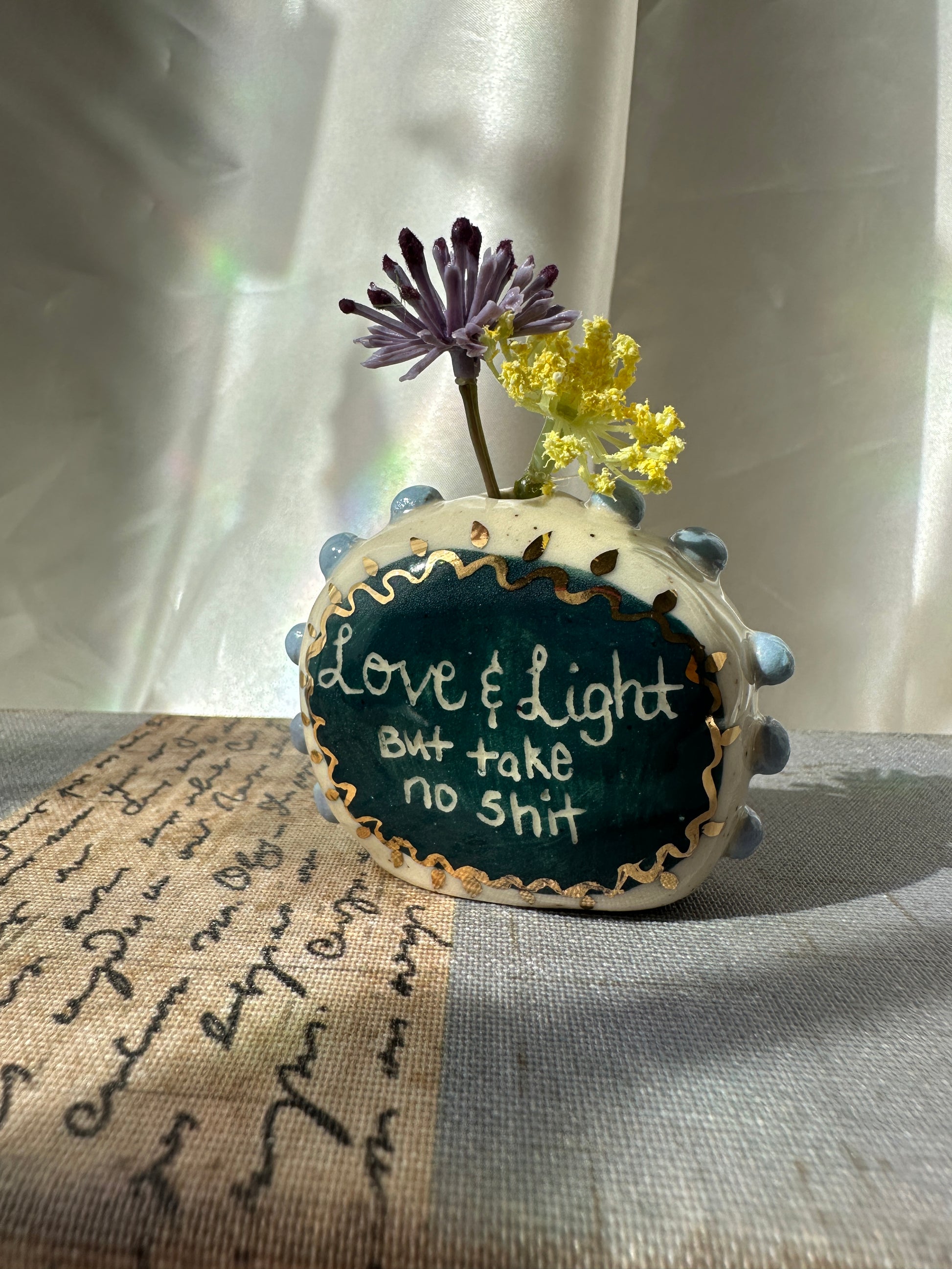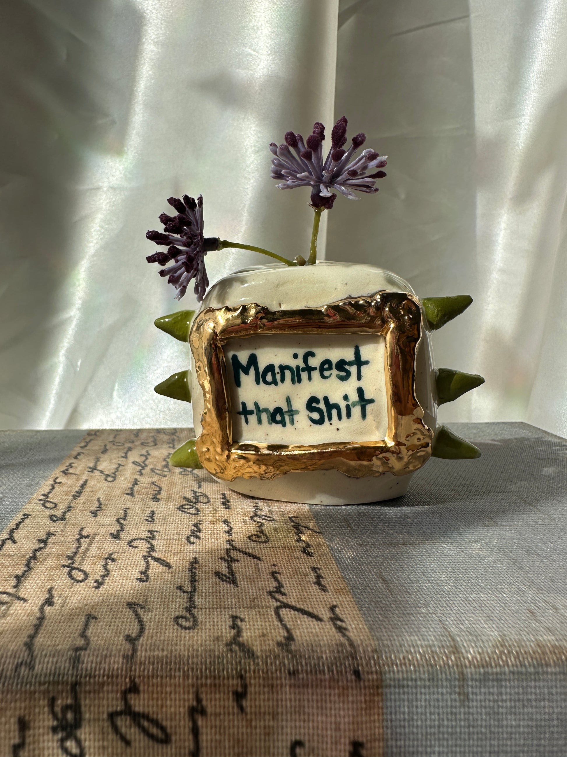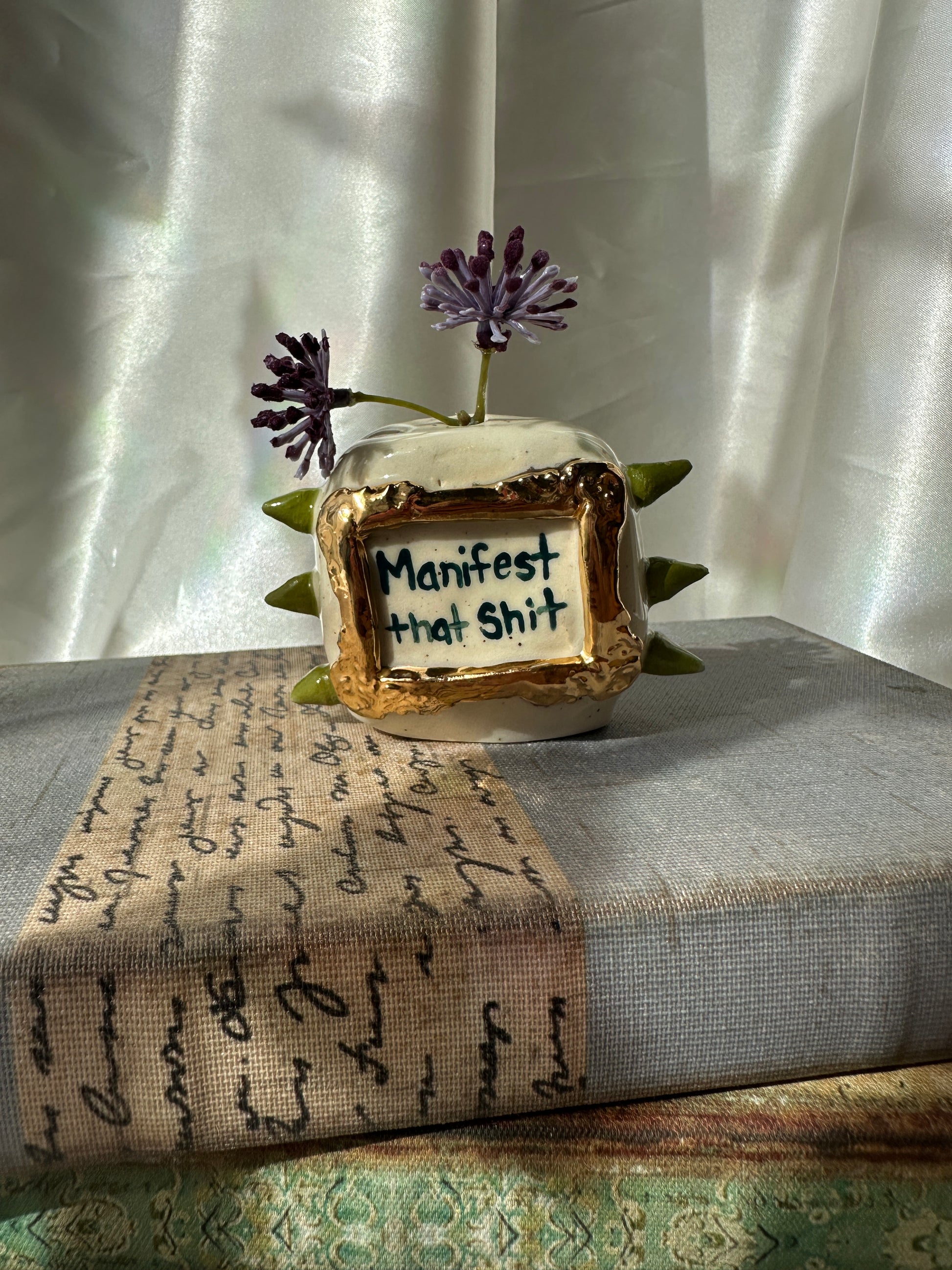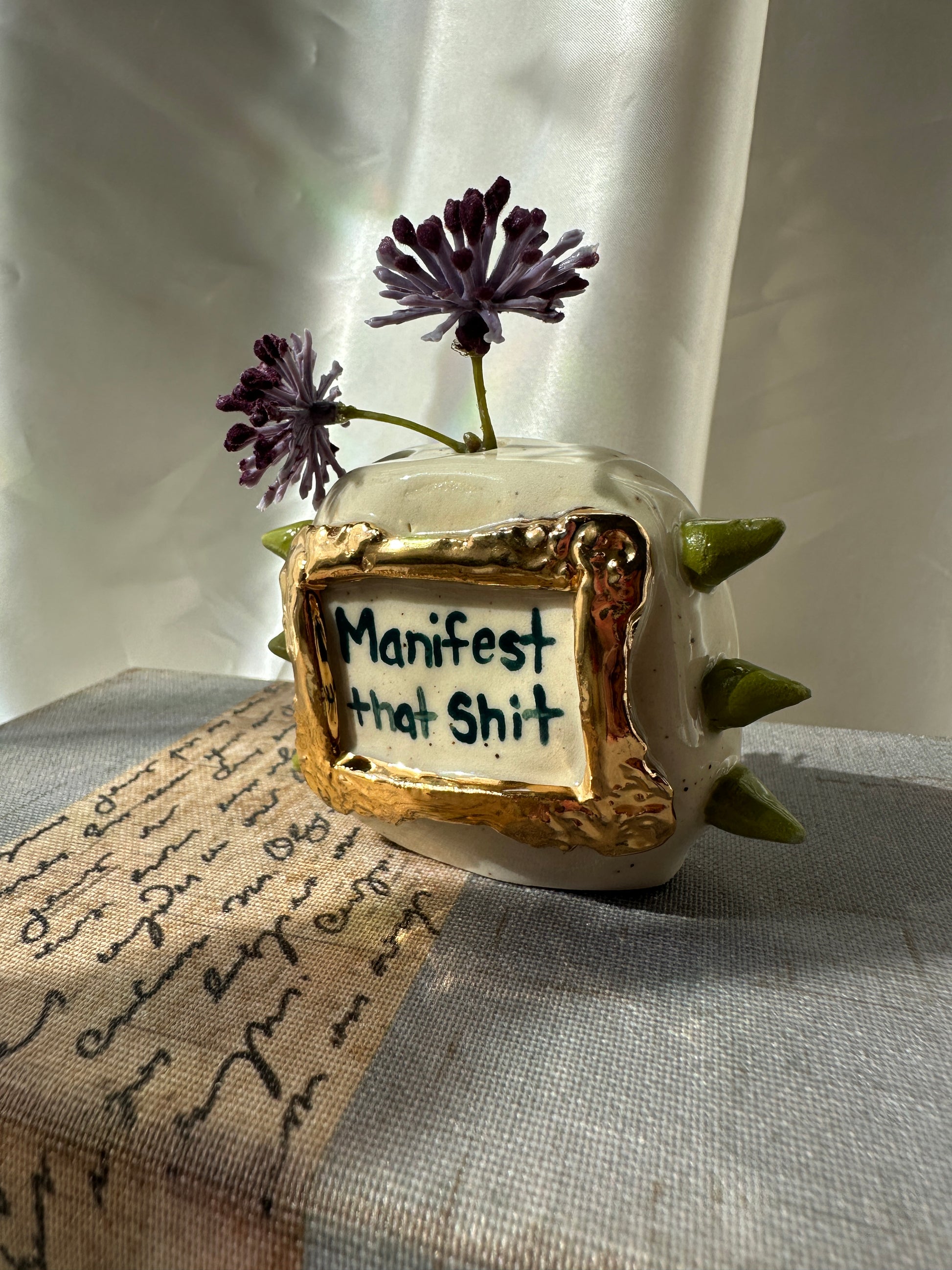 What better way to express yourself with your decor than with expressions and a little whimsy. These one of a kind bud vases was handmade and patiently glazed. After it's glaze firing to approximately 2,118 degrees Fahrenheit, real 22k gold is meticulously brushed on and fired again to approximately 1,323 Fahrenheit. Once cooled the base is then sanded to a smooth finish to avoid any scratches on your furniture.