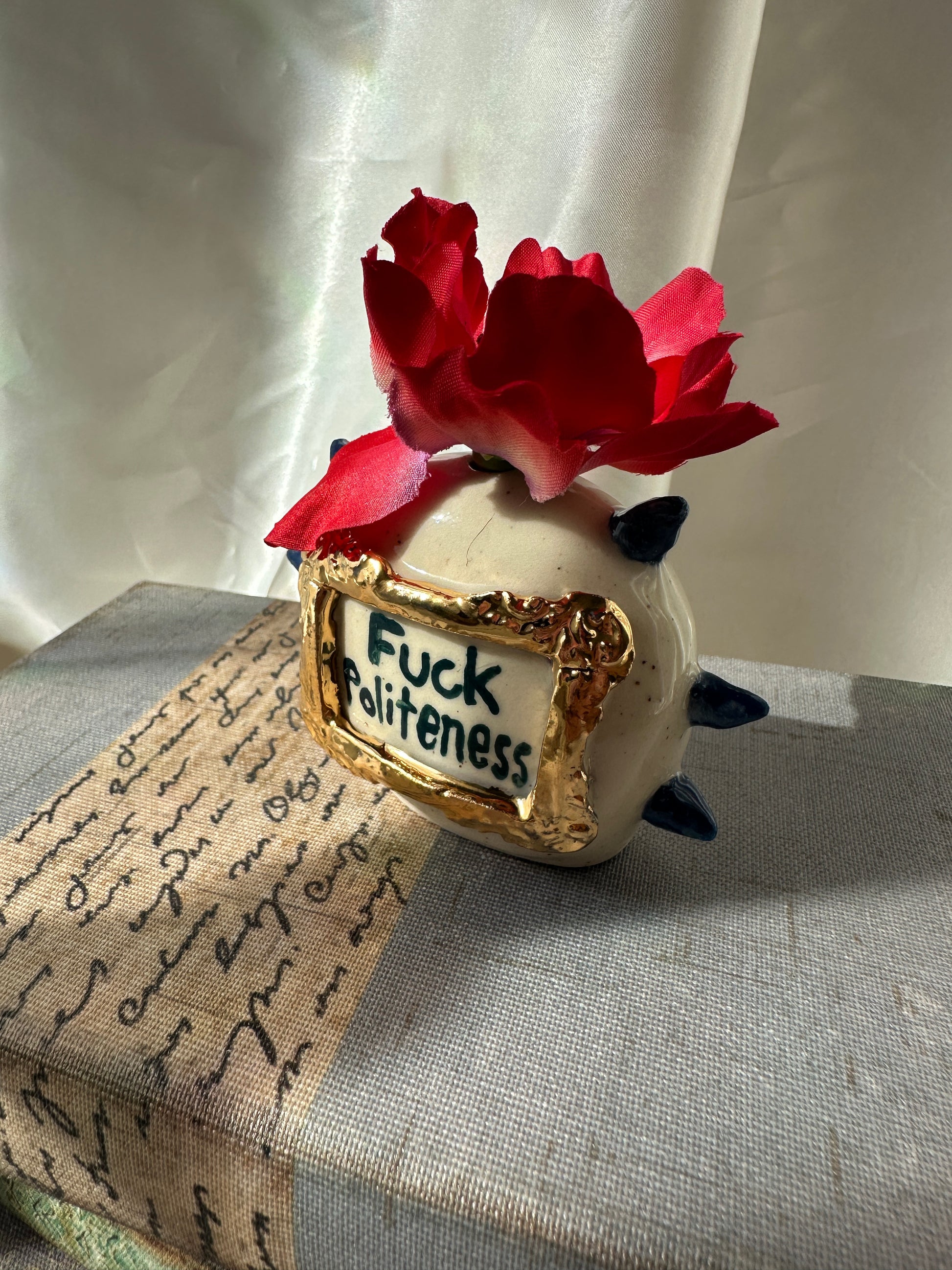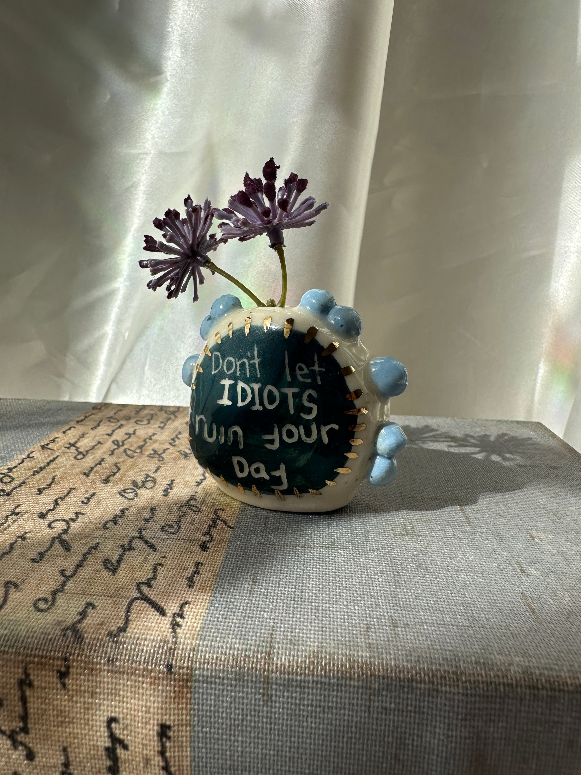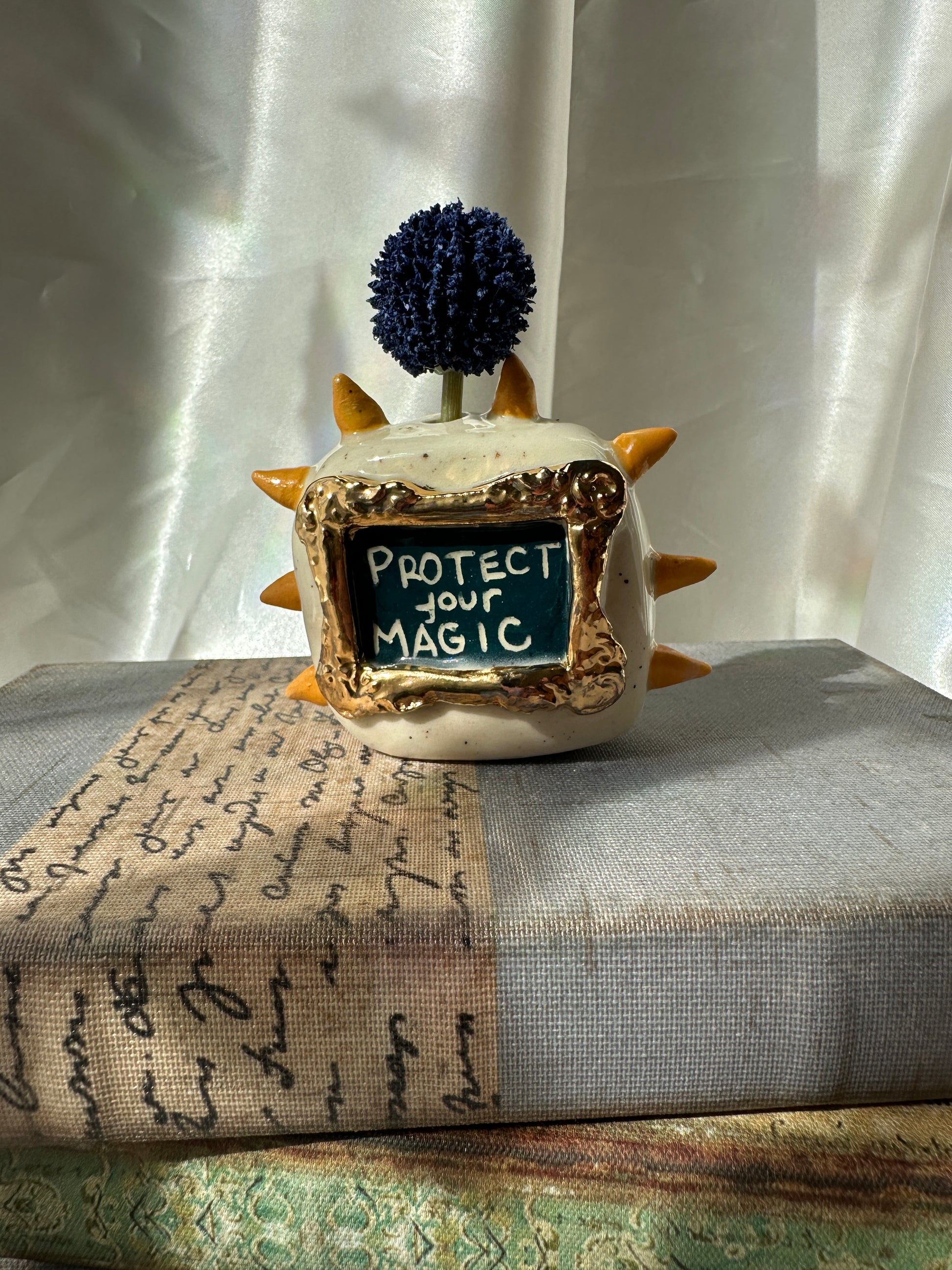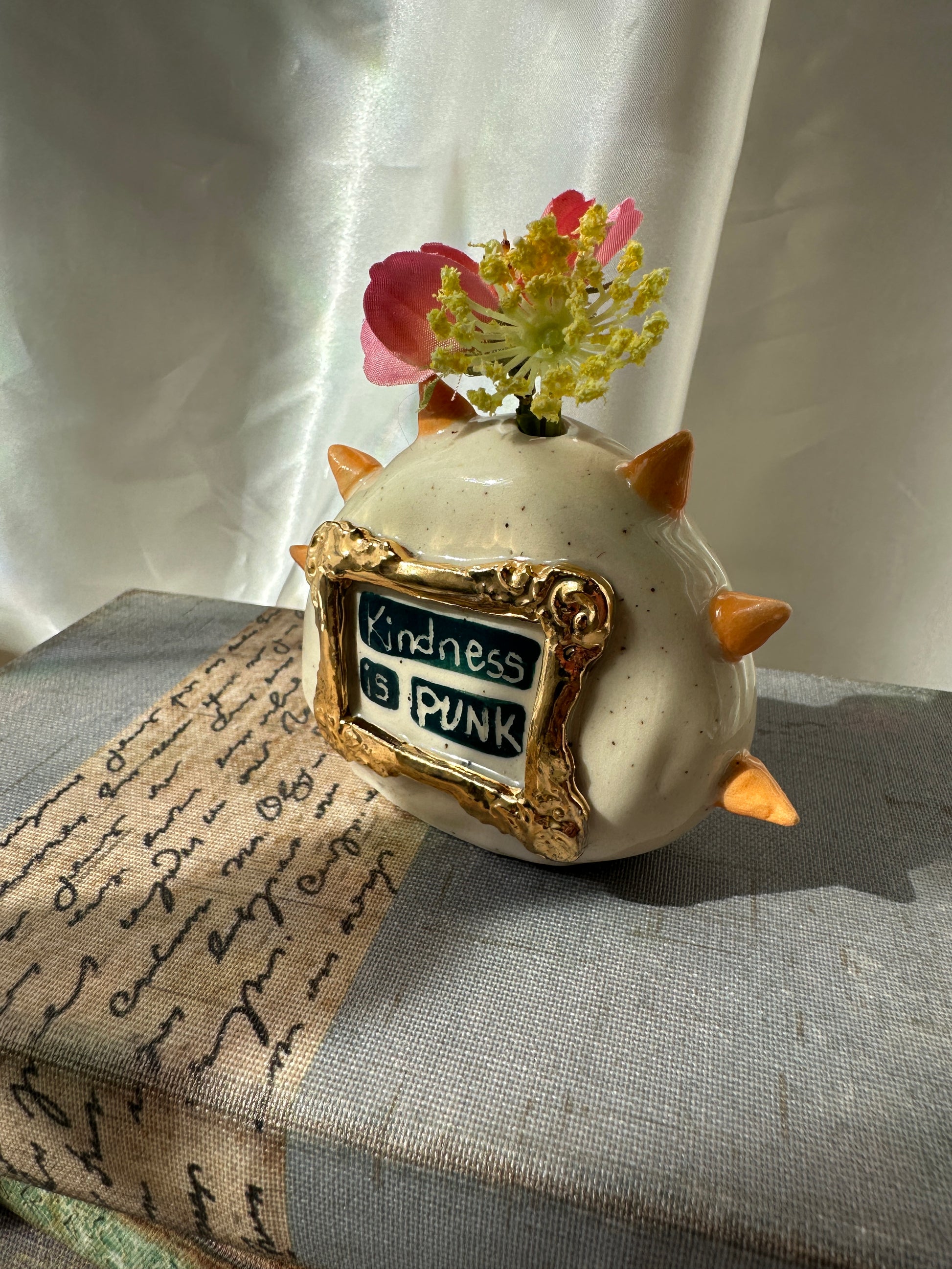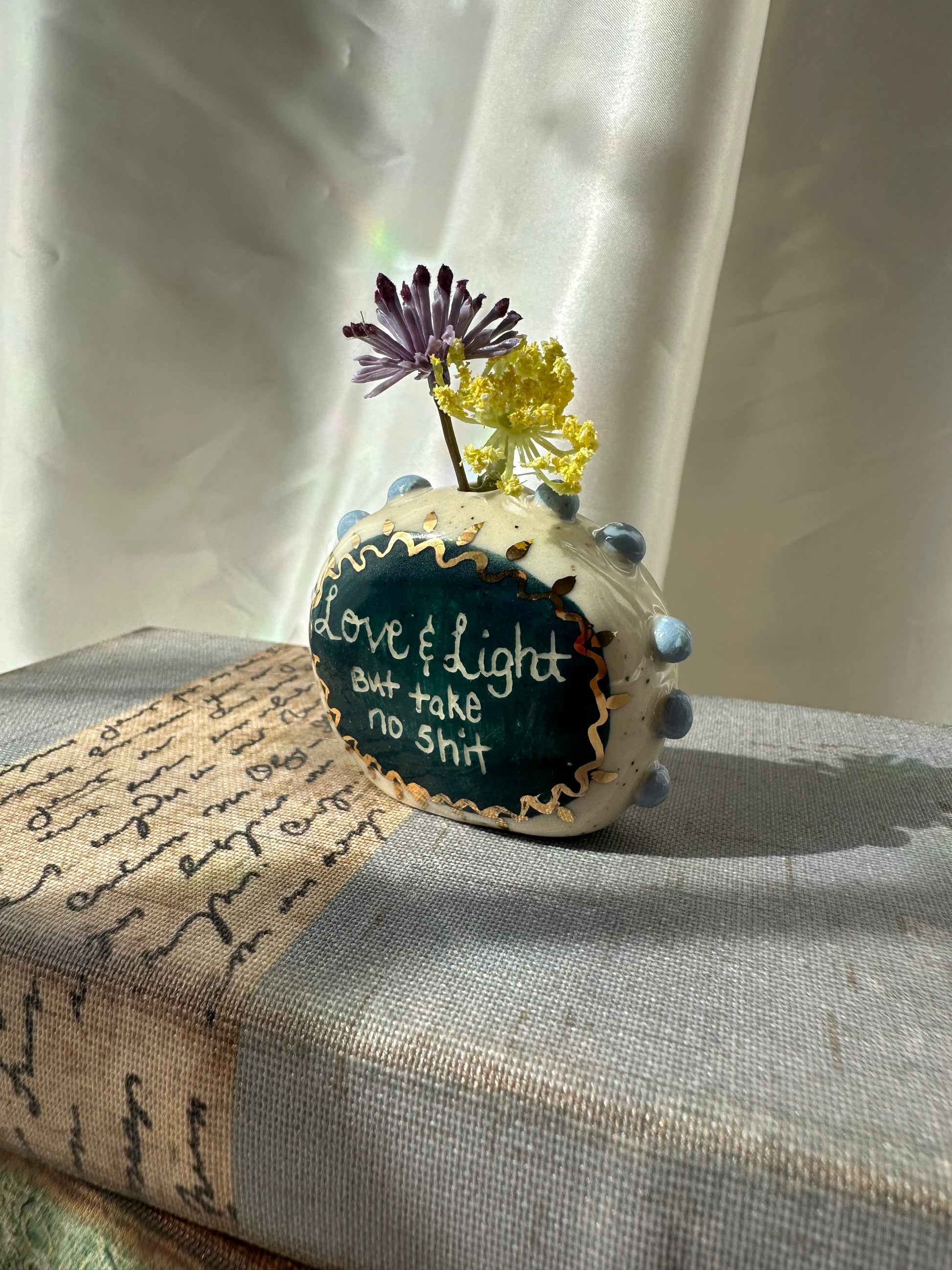 What better way to express yourself with your decor than with expressions and a little whimsy. These one of a kind bud vases was handmade and patiently glazed. After it's glaze firing to approximately 2,118 degrees Fahrenheit, real 22k gold is meticulously brushed on and fired again to approximately 1,323 Fahrenheit. Once cooled the base is then sanded to a smooth finish to avoid any scratches on your furniture.