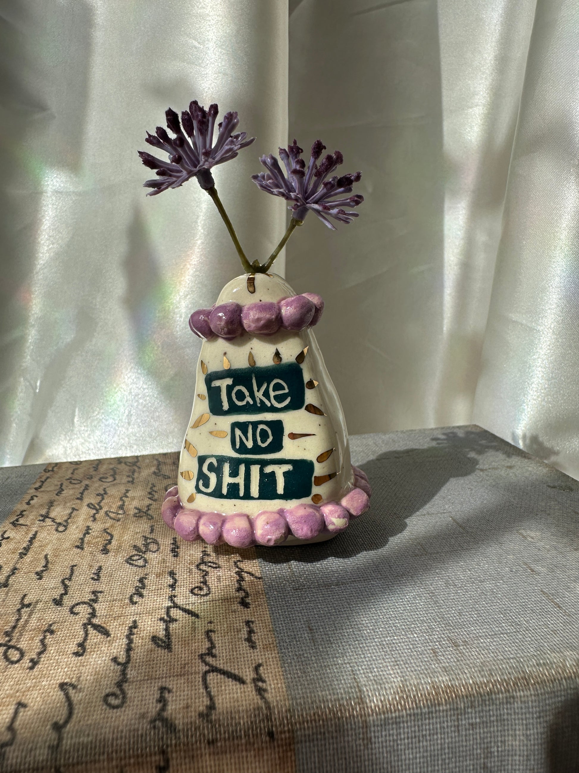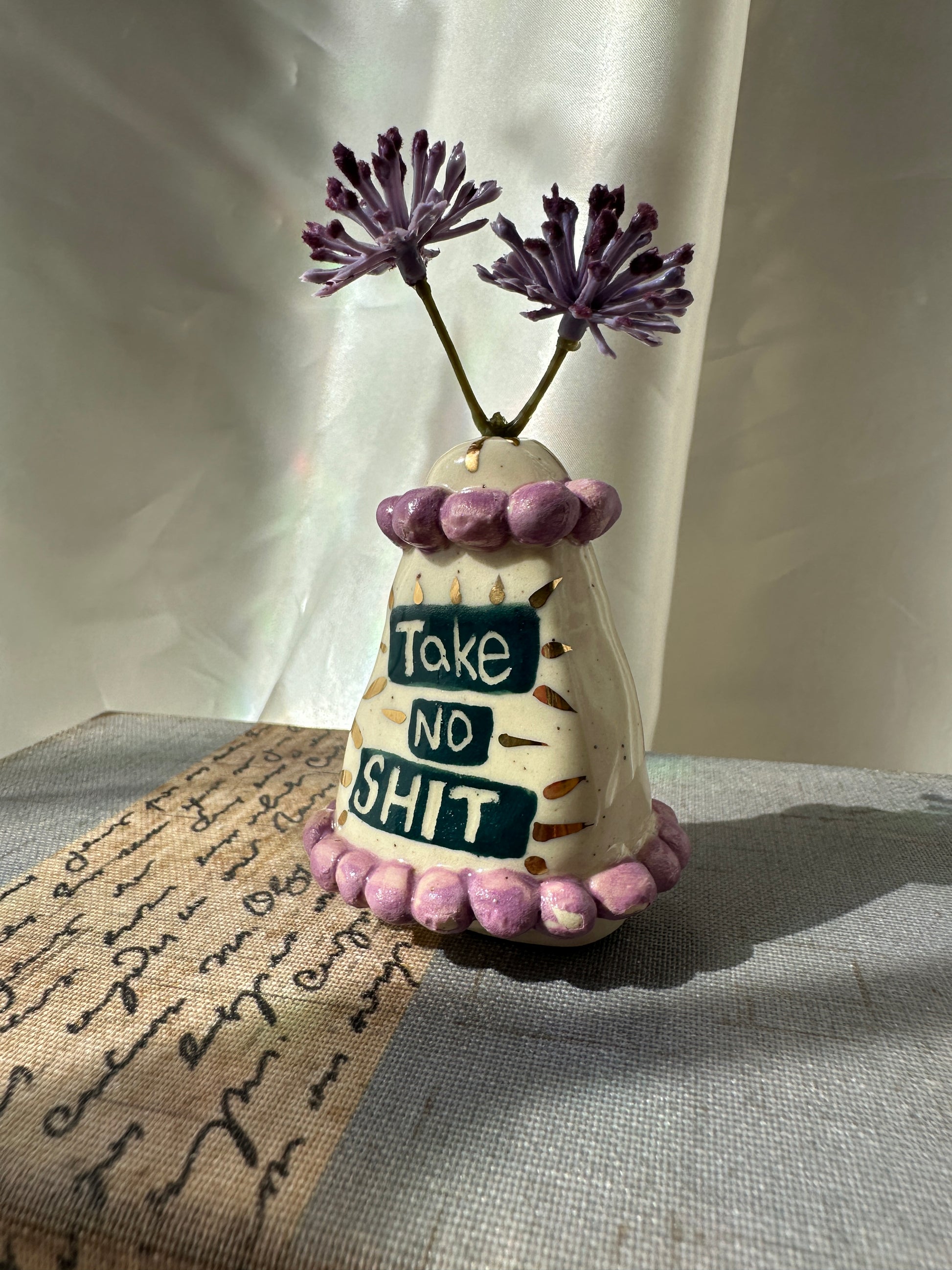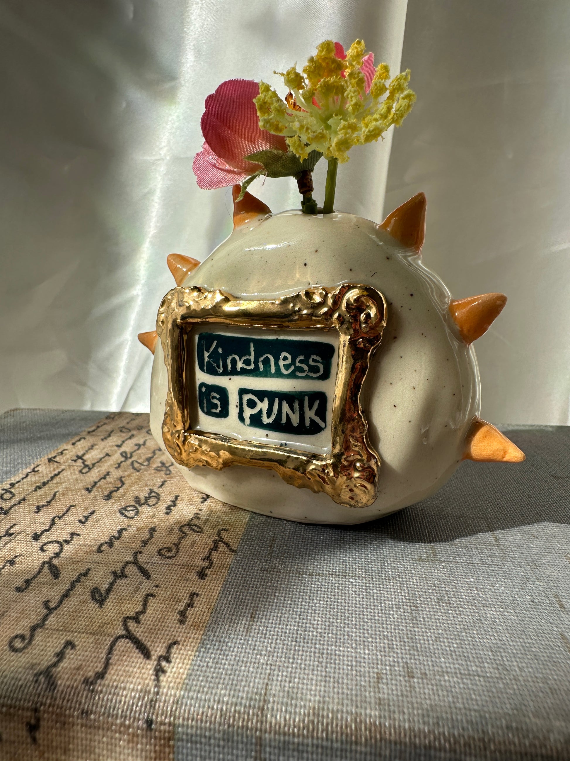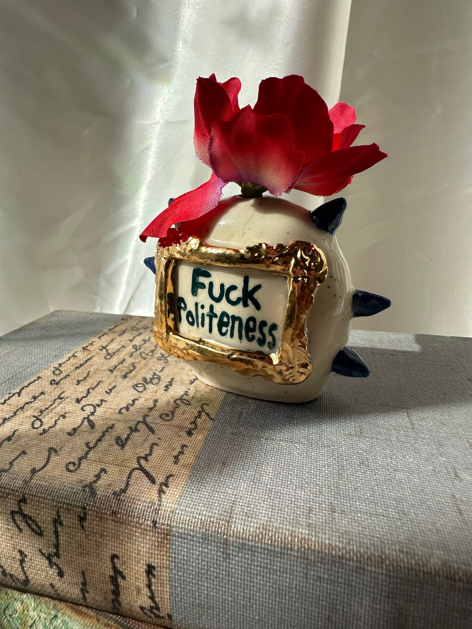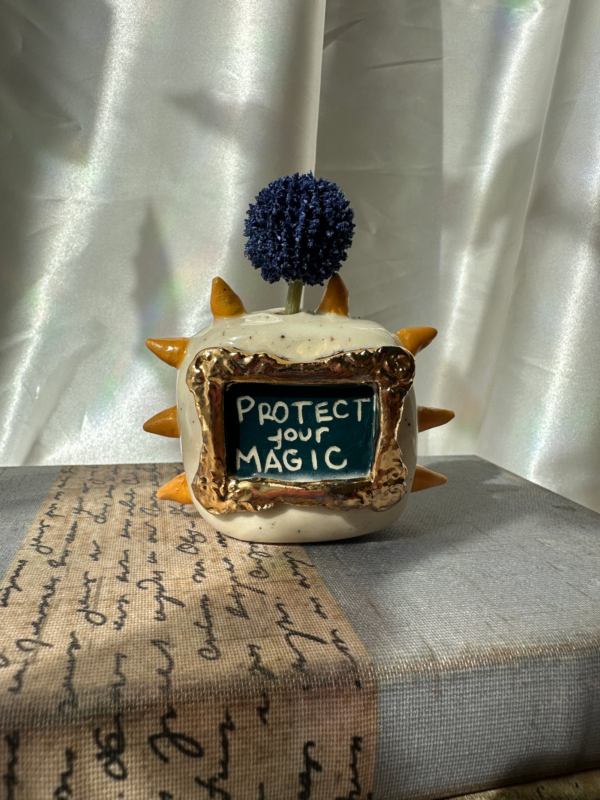 What better way to express yourself with your decor than with expressions and a little whimsy. These one of a kind bud vases was handmade and patiently glazed. After it's glaze firing to approximately 2,118 degrees Fahrenheit, real 22k gold is meticulously brushed on and fired again to approximately 1,323 Fahrenheit. Once cooled the base is then sanded to a smooth finish to avoid any scratches on your furniture.