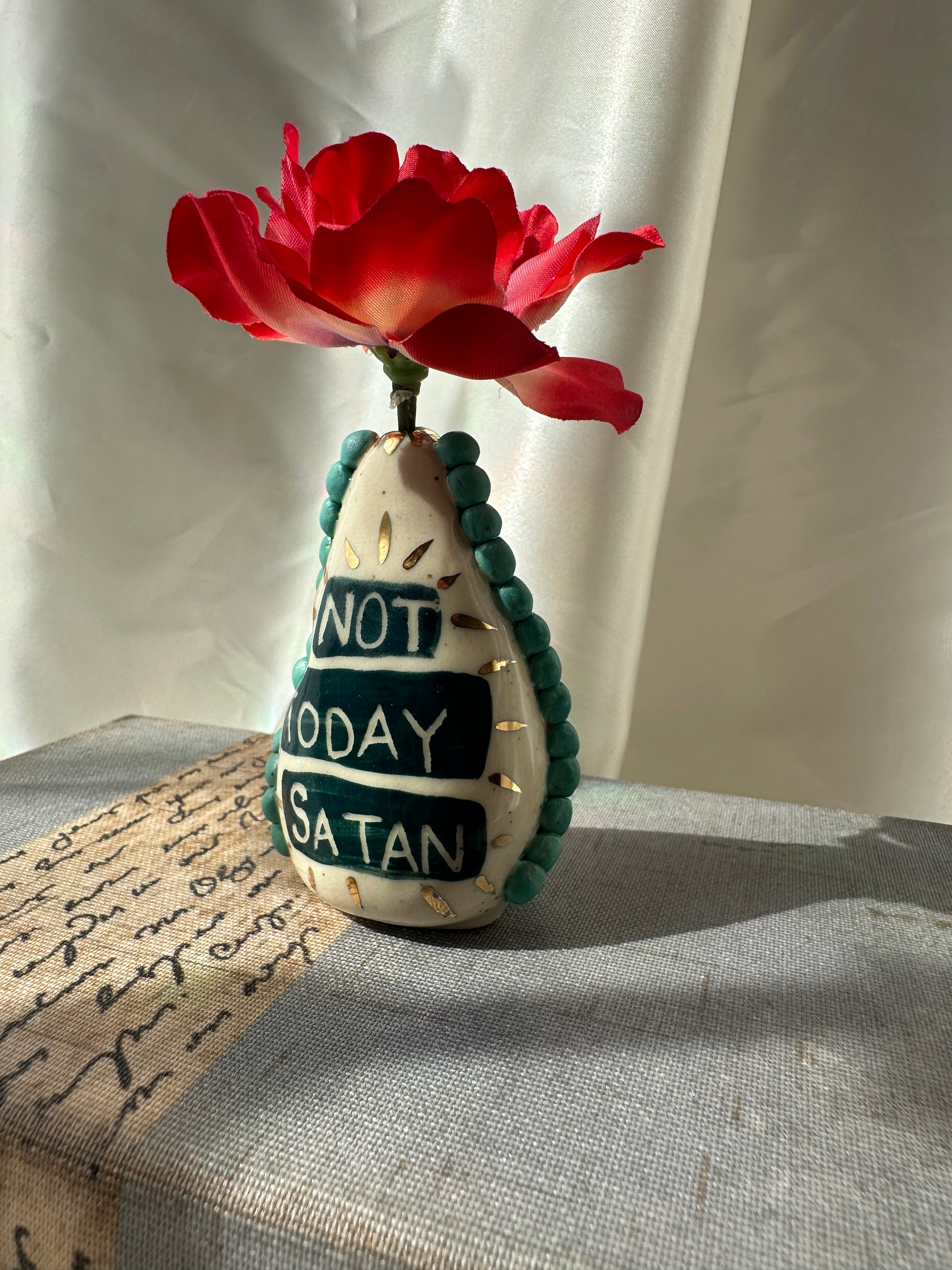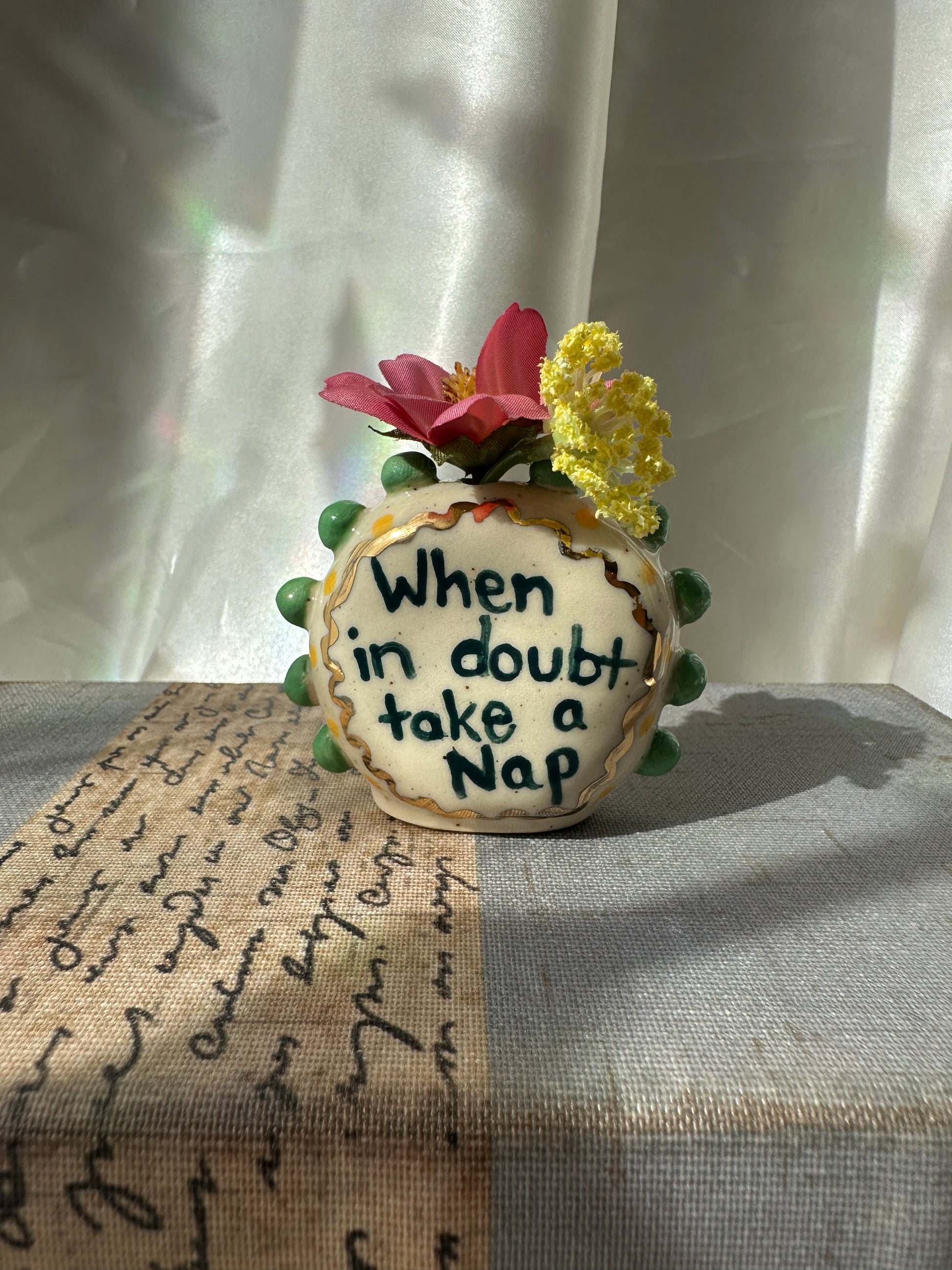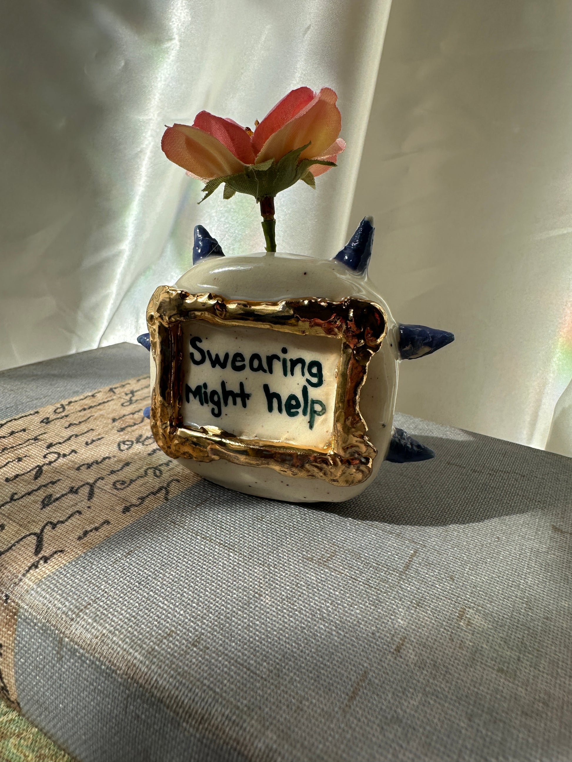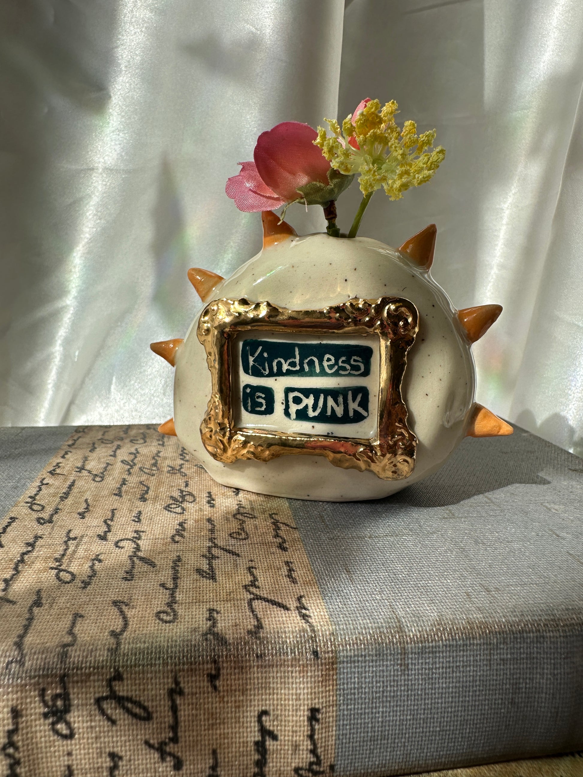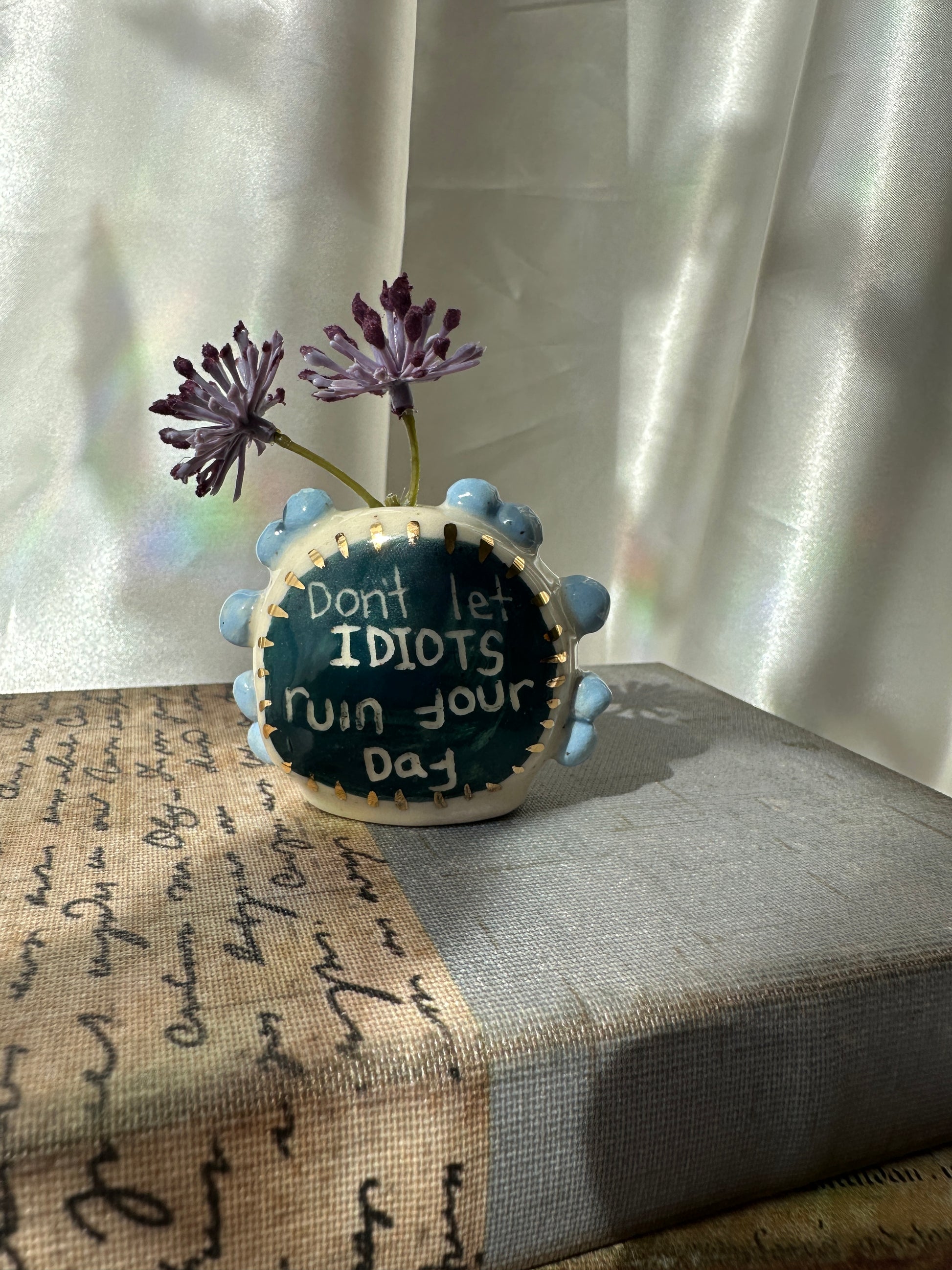 What better way to express yourself with your decor than with expressions and a little whimsy. These one of a kind bud vases was handmade and patiently glazed. After it's glaze firing to approximately 2,118 degrees Fahrenheit, real 22k gold is meticulously brushed on and fired again to approximately 1,323 Fahrenheit. Once cooled the base is then sanded to a smooth finish to avoid any scratches on your furniture.