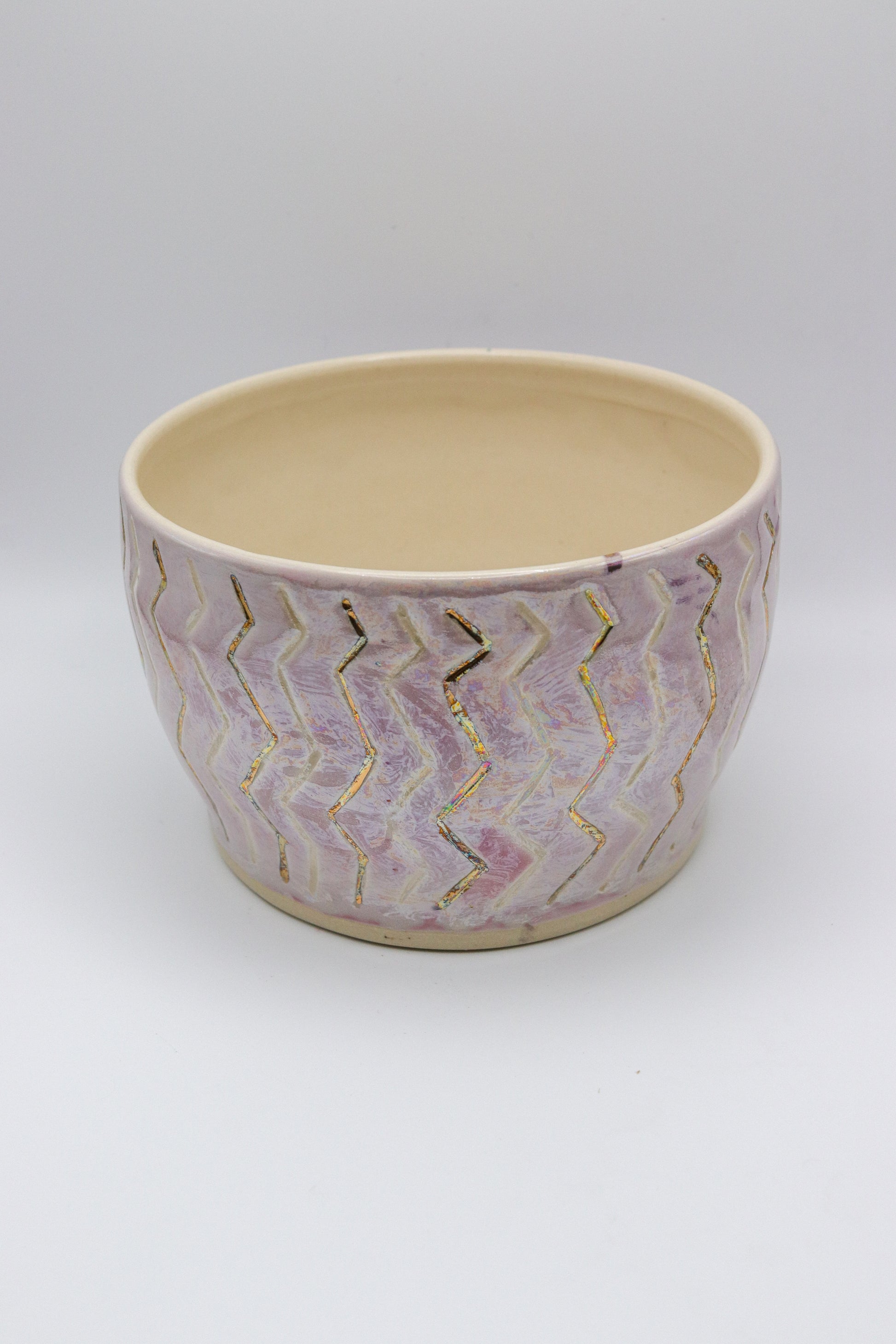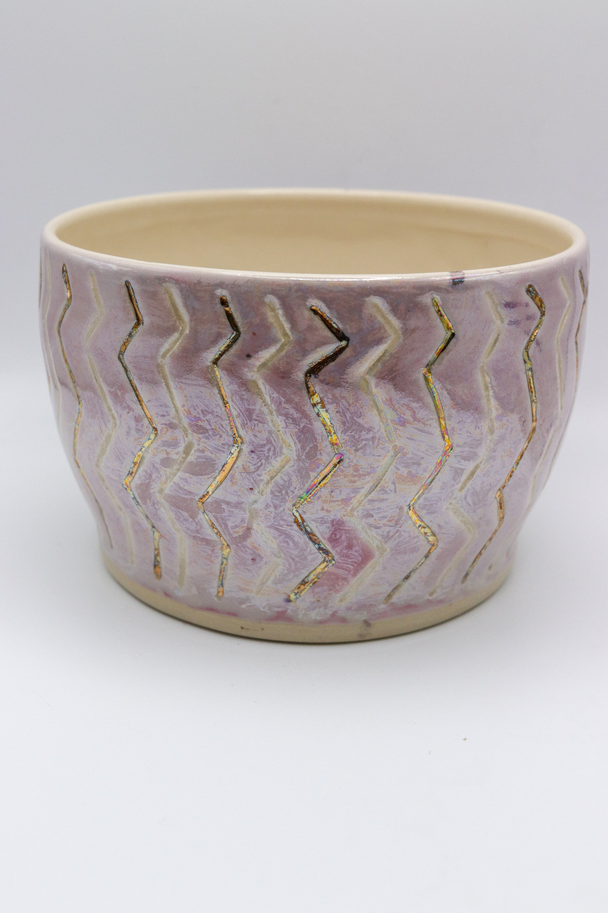 This happy little planter is perfect for an office space or to brighten up your work ares. It is wheel thrown and hand carved. Its accented with not only real 22k gold but mother of pearl which gives it a gorgeous iridescent finish. Let the sun shine on it to see it rainbow colors shine.