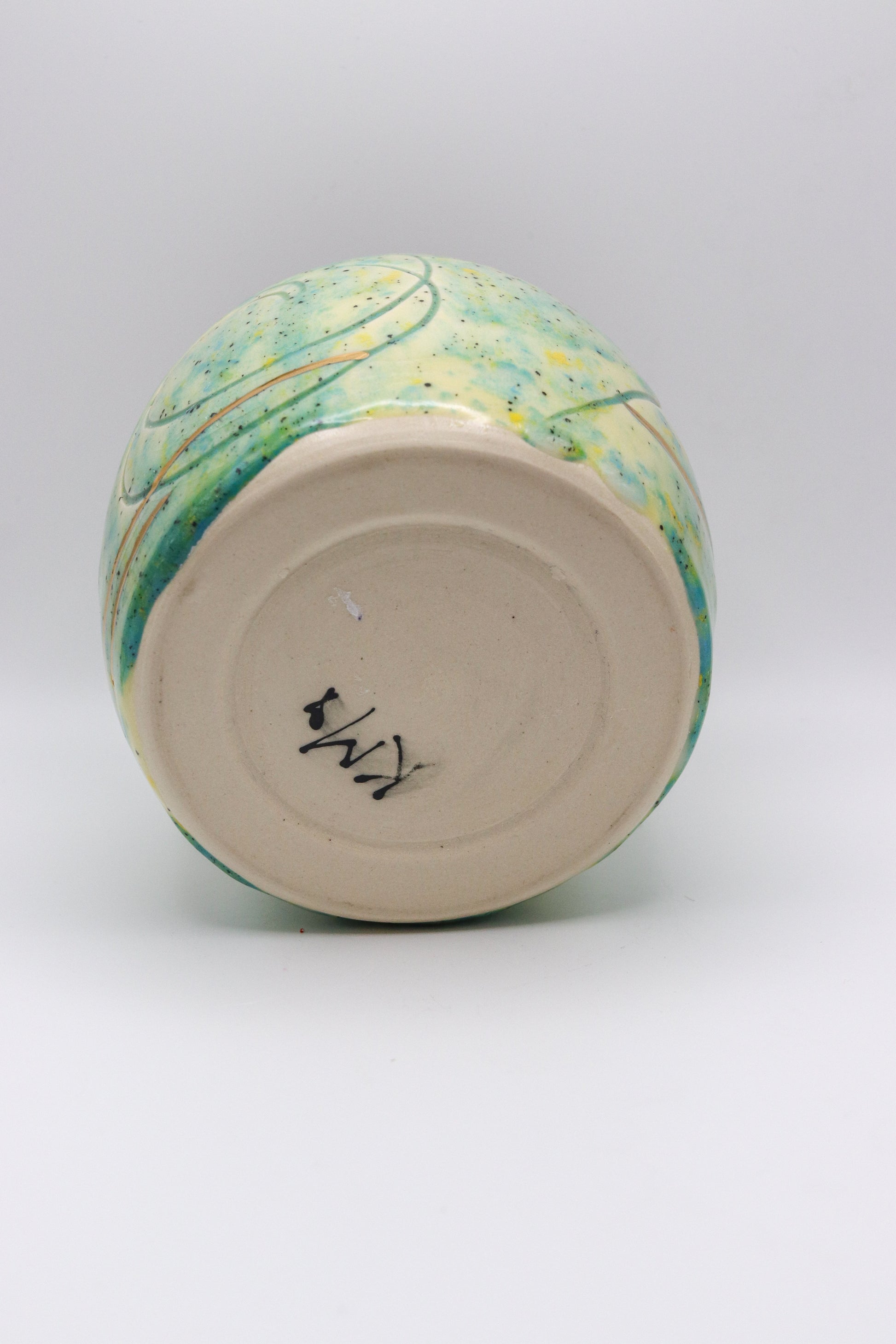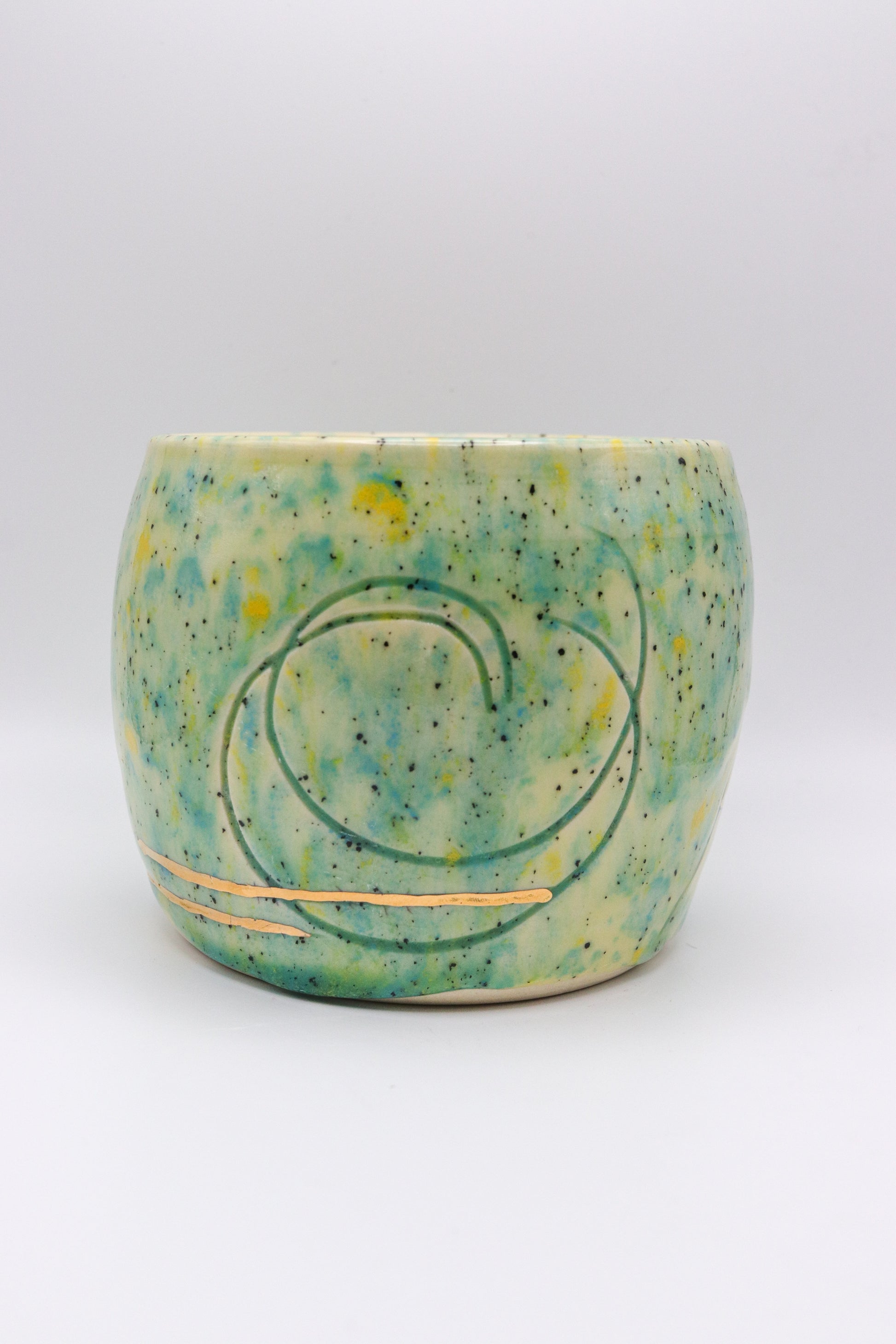 This cute little pot is wheel thrown and hand carved, It accented with real 22k gold. It is 3.5 inches wide and 3.5 inches deep.