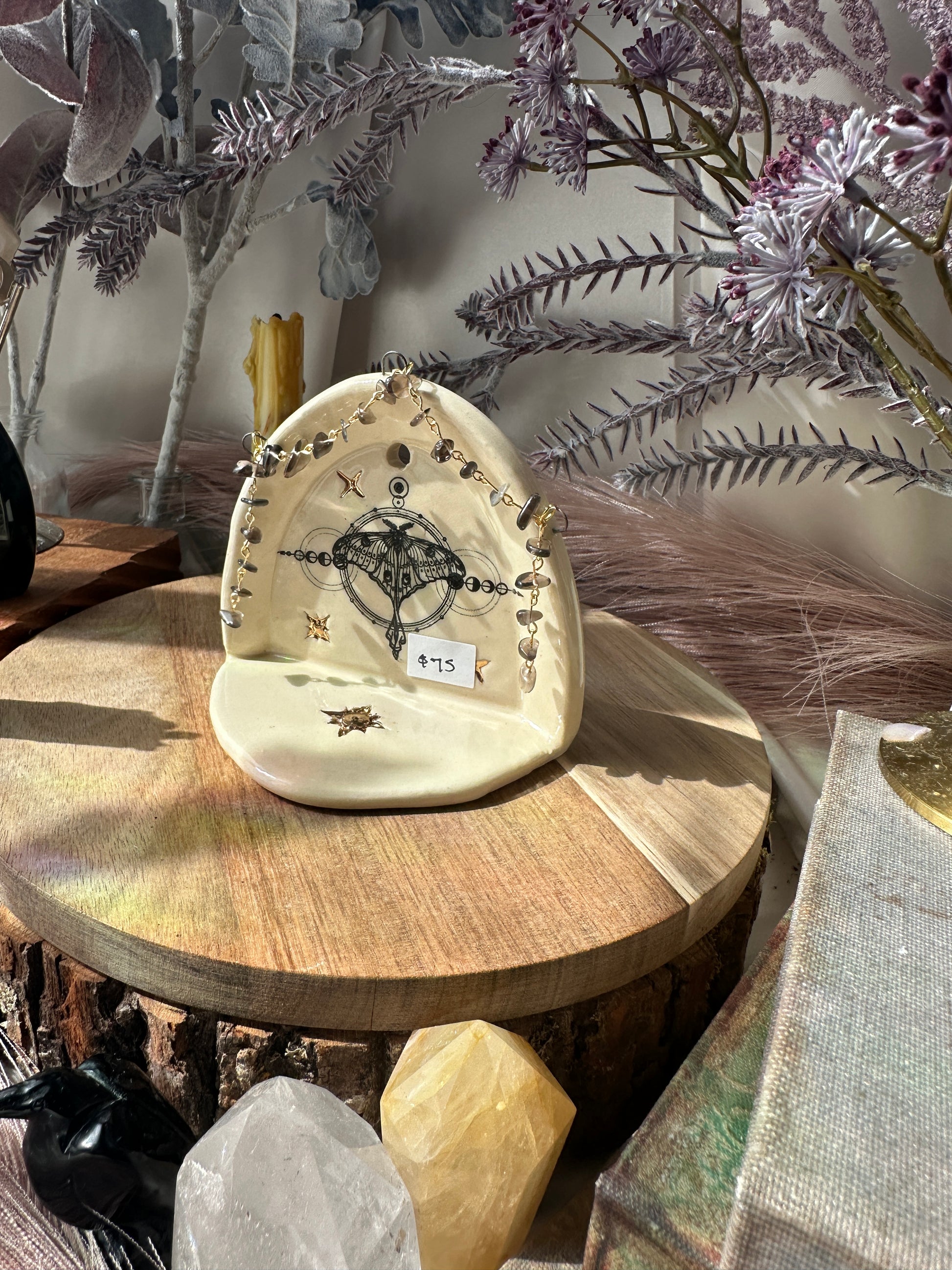 Moths hold a special place in my heart. They symbolize intuition and the pursuit of a higher purpose through their attraction to light. Adorned with Smokey Obsidian for protection and grounding.