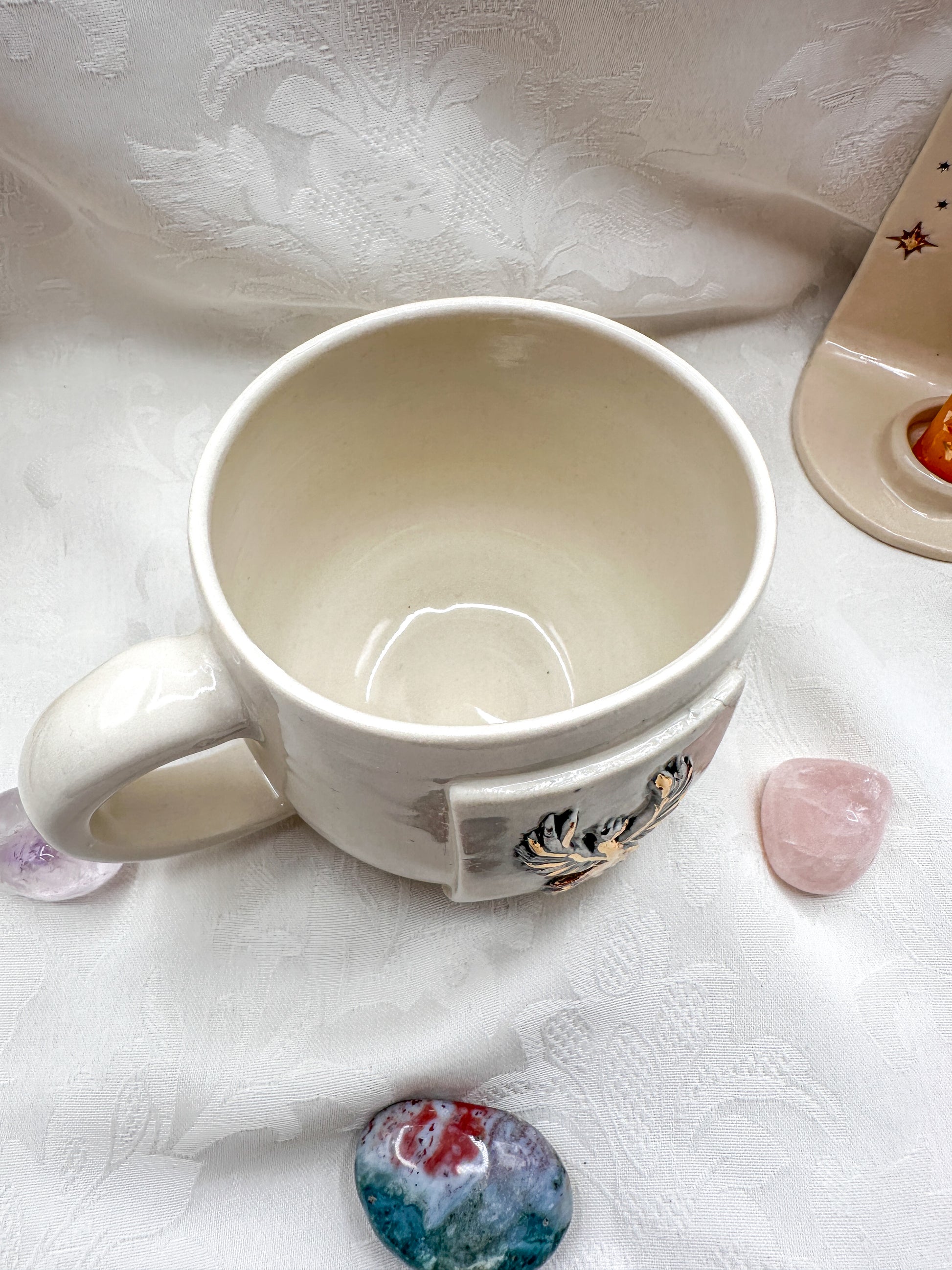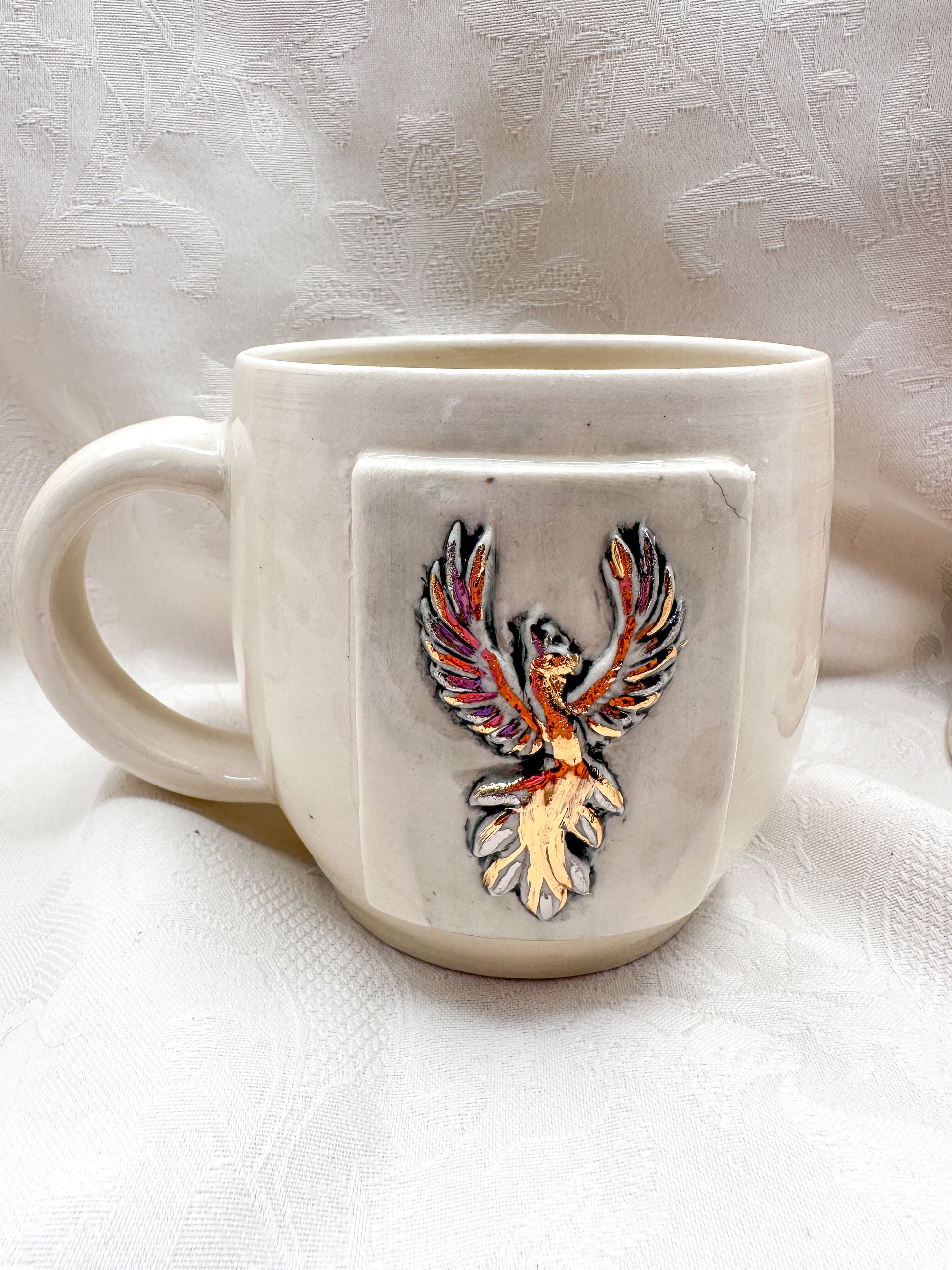 This gorgeous phoenix mug is wheel thrown and accented with real 22k gold. This piece is not microwave or dishwasher safe. It is 3.5 inches wide and 3.5 inches deep.