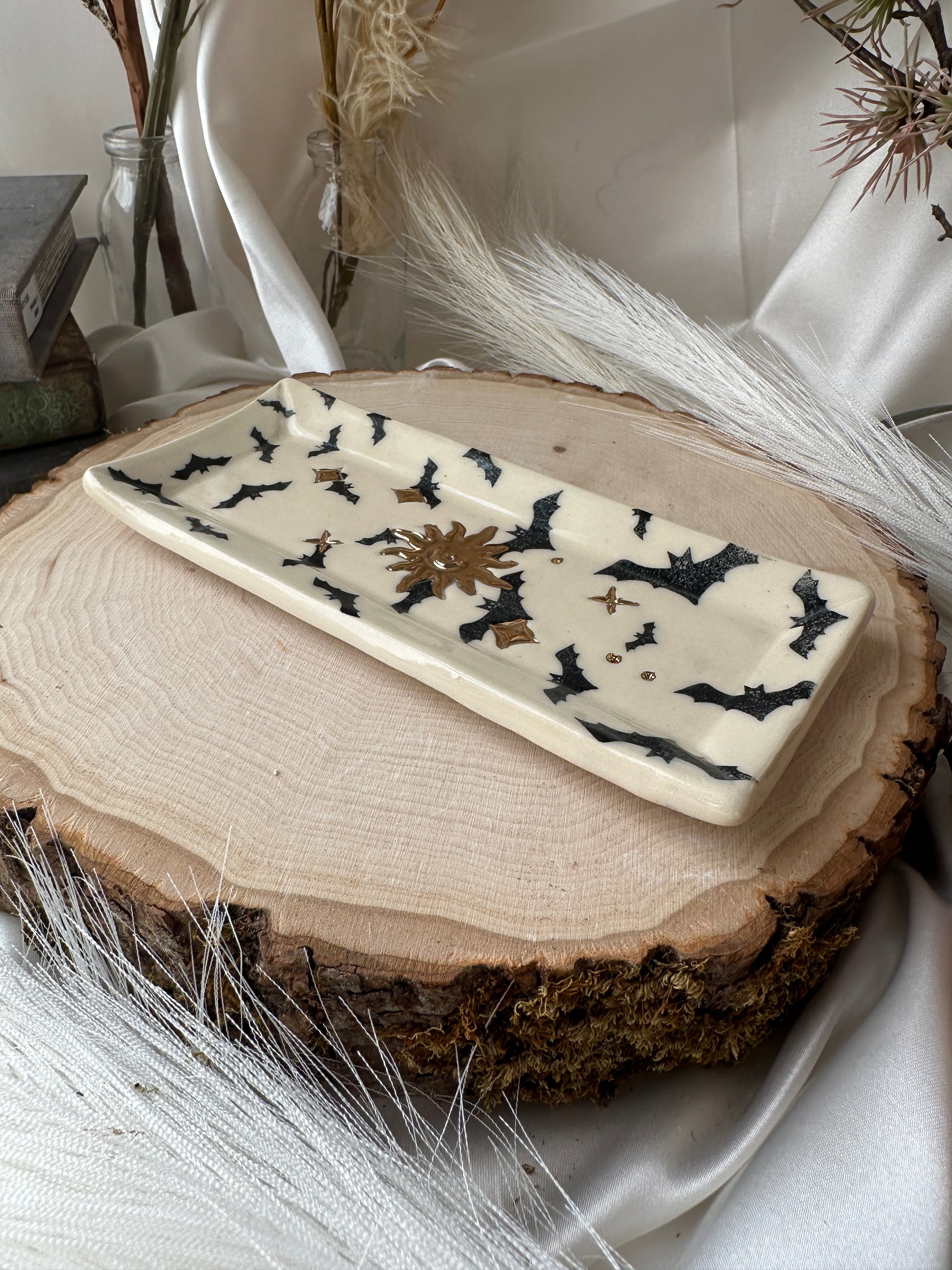 I wanted to make a batch of trinket dishes that double as Incense burners. So while this piece is perfect for trinkets. It hold a little hole in the middle for stick incense. Use as you wish! It is accented with real 22k gold.
