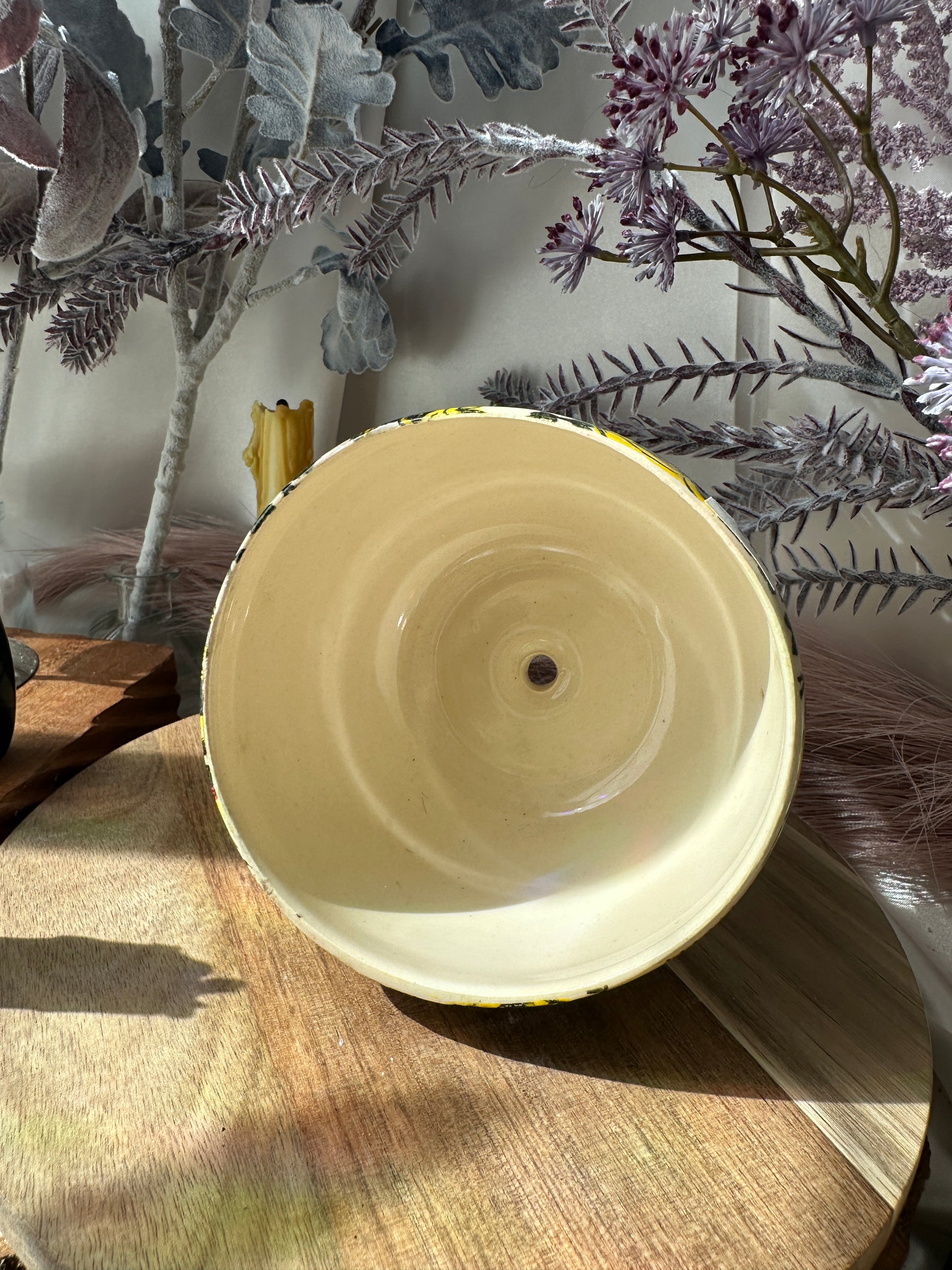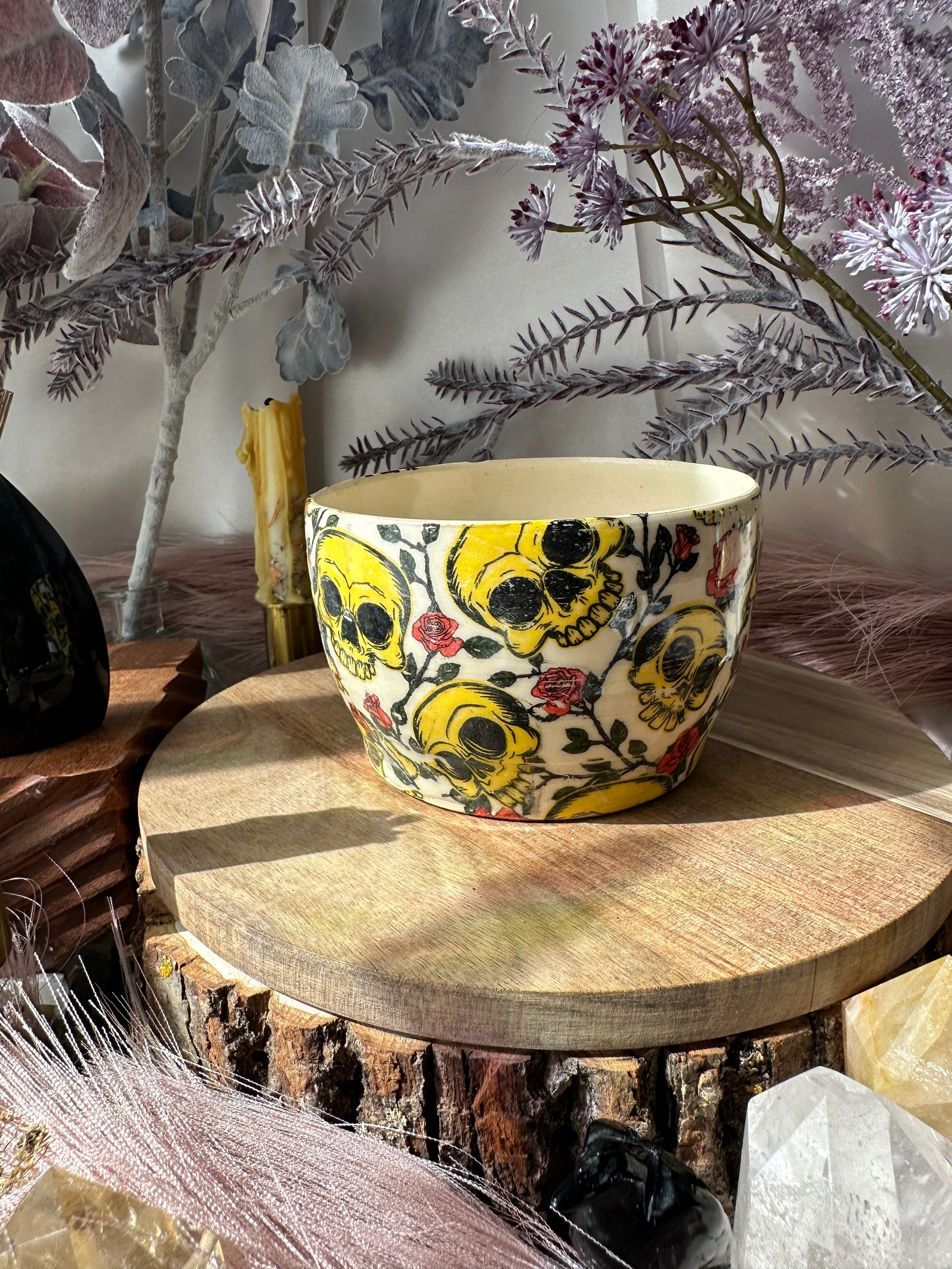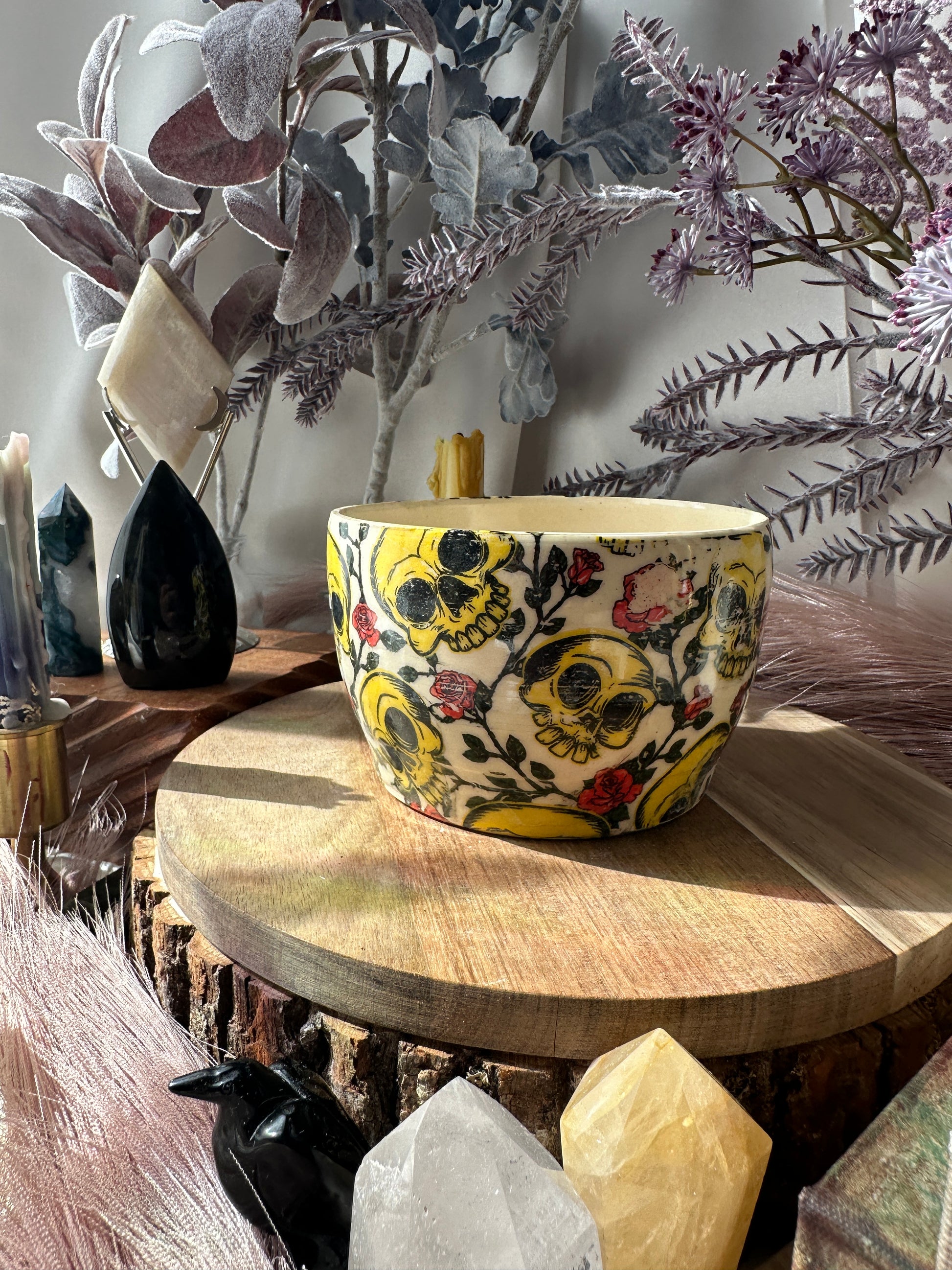 This fun skull and rose planter is wheel thrown and has a drainage hole. It is 4.5 inches wide and 3 inches deep.