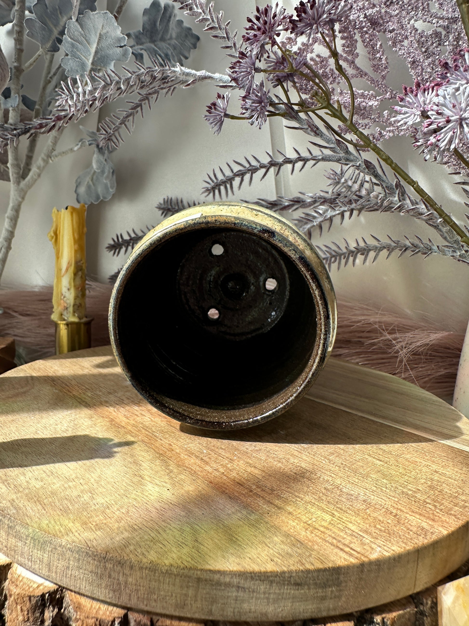 This gorgeous little planter is wheel thrown with a fun bubbly shape on a gorgeous dark brown clay. Its beautiful glaze is accented with splashes of real 22k gold. In the right lighting you can really see it in its full glory. It has a 3 inch wide opening and is 4 inches deep.