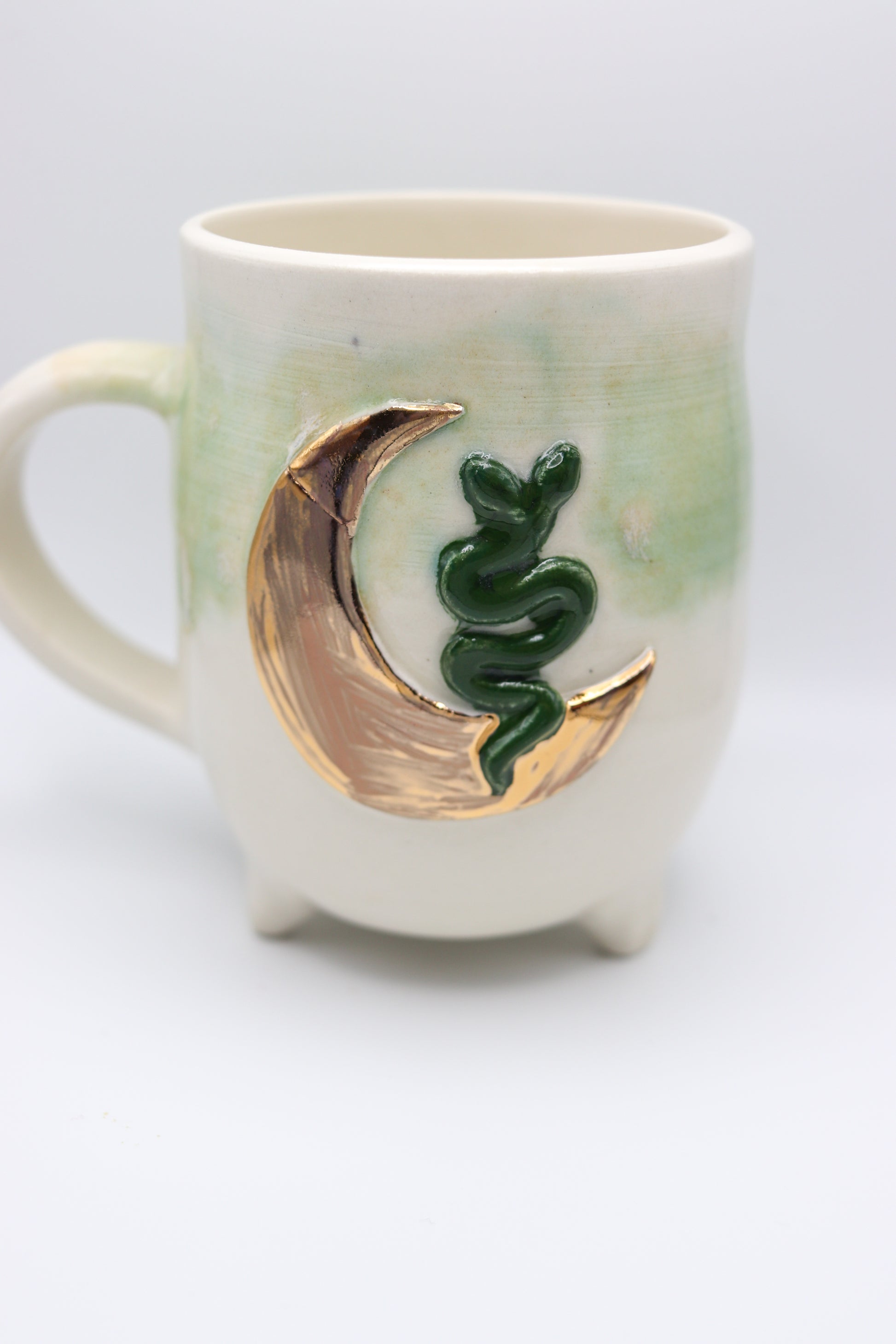 This snake and moon mug was wheel thrown. The moon is glazed with real 22k gold making this piece not dishwasher or microwave safe. The opening is 3 inches wide and 4 inches deep.