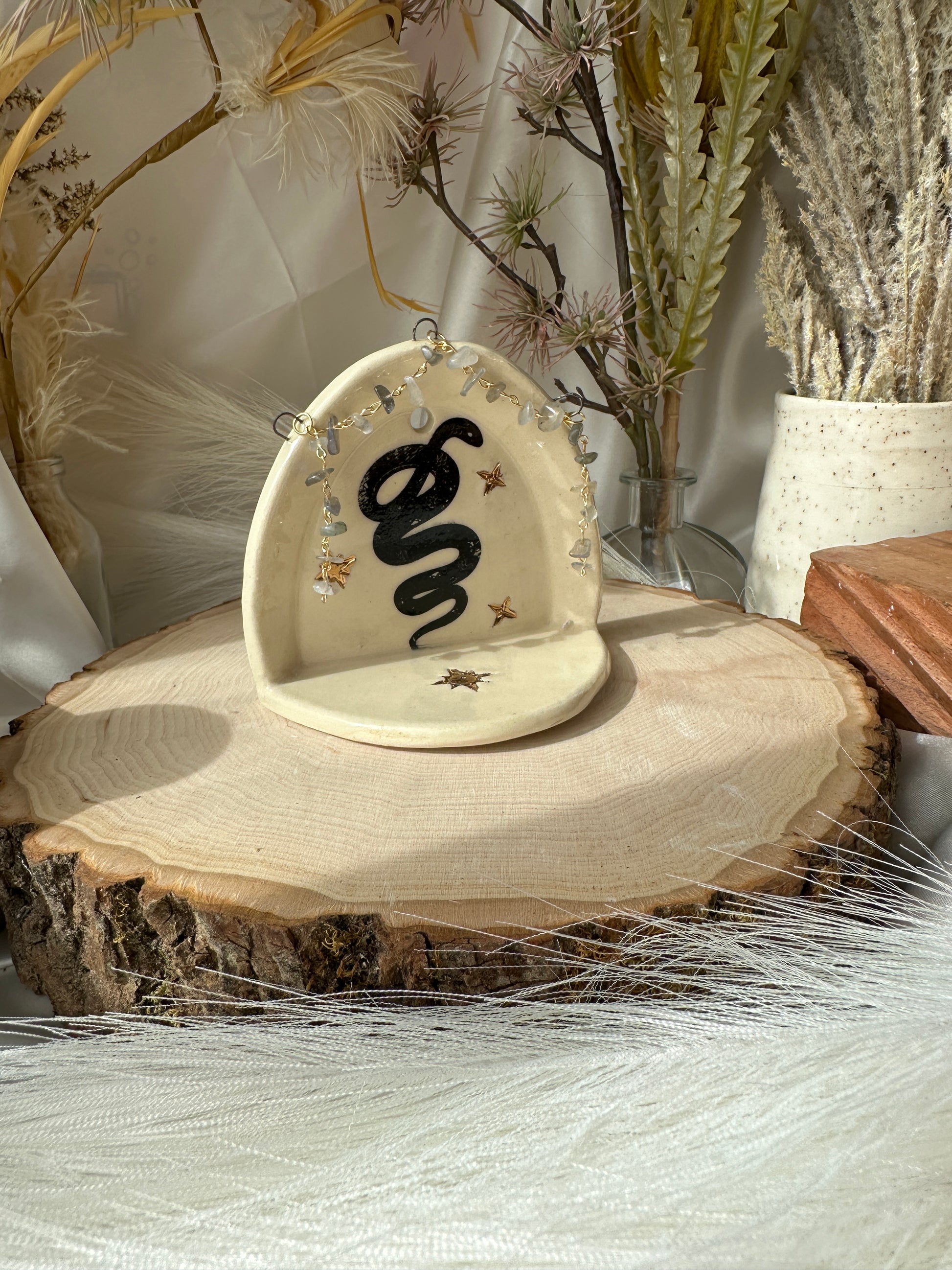 Snakes widely symbolize rebirth due to the shedding of their skin. Leaving behind what no longer serves then as we sometimes need to. While change can be hard, it's often what's best for us to move forward. This altar is adorned with labradorite.